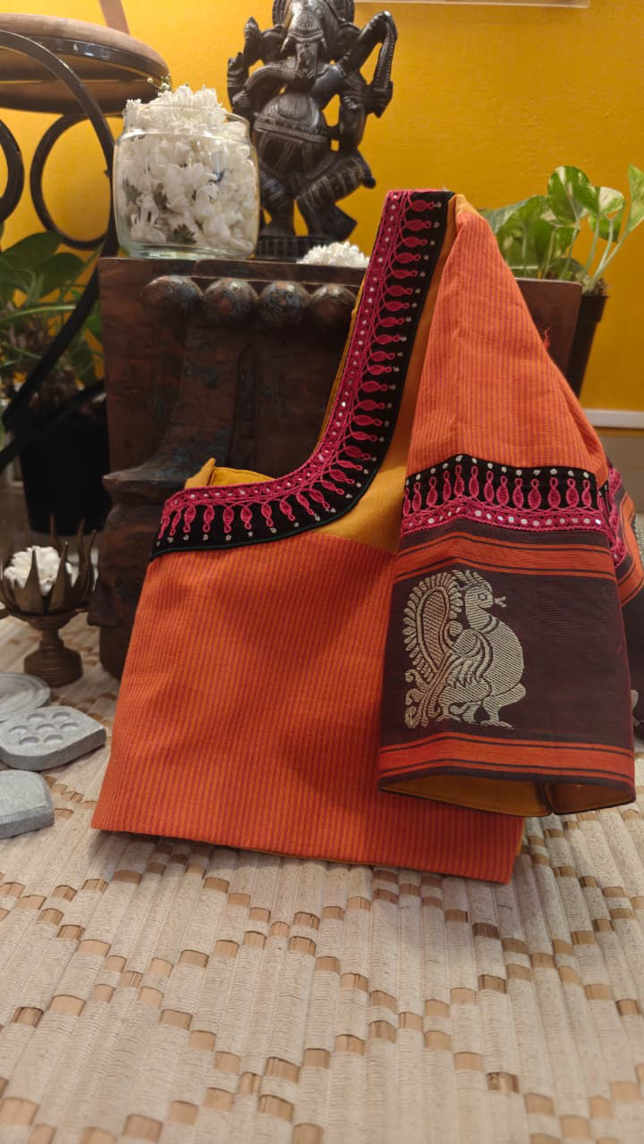 Kanchi cotton woven with graceful Annams — timeless motifs that carry stories of tradition and quiet strength. The weave is crisp yet comfortable, holding structure while remaining beautifully breathable.