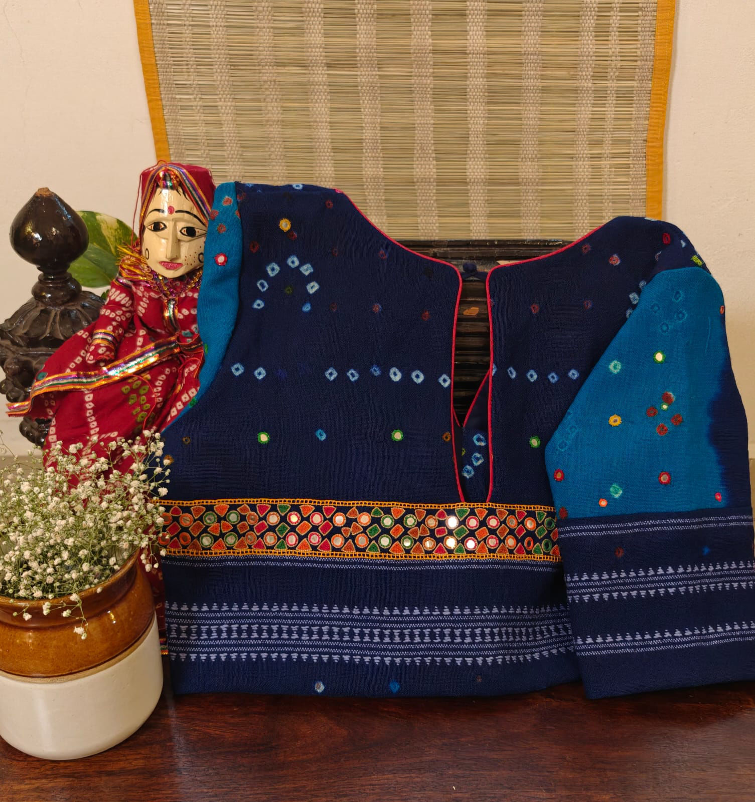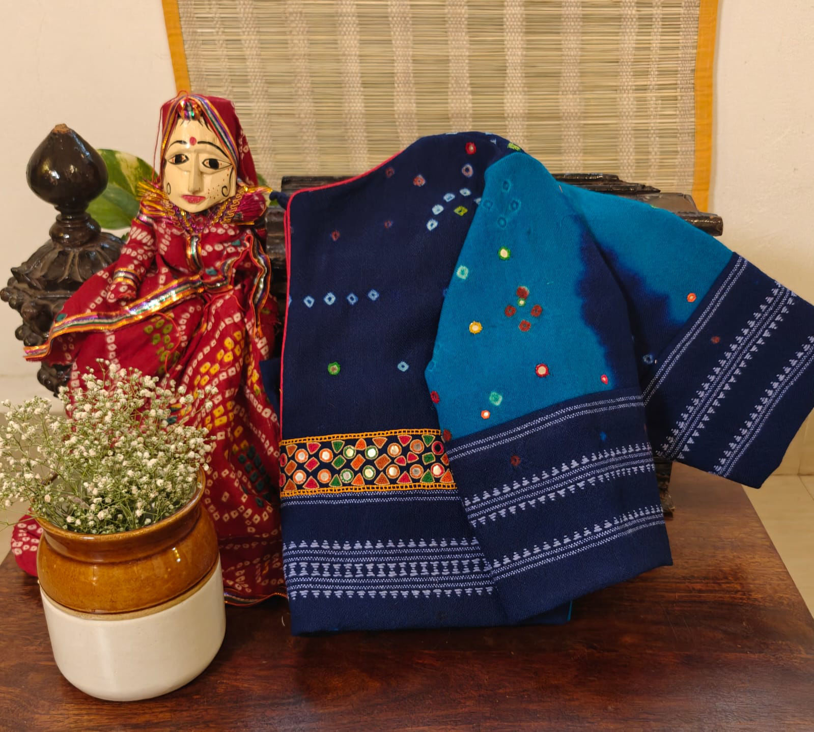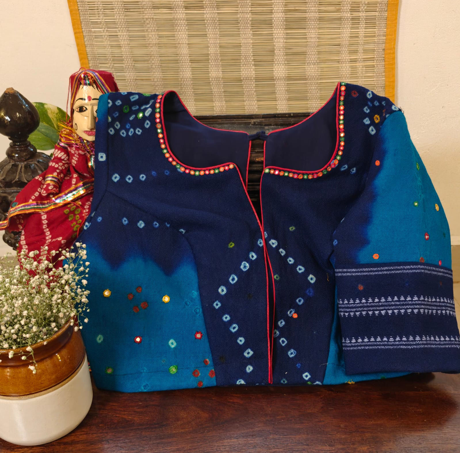 Bandhani in shades of blue, brought alive with vibrant mirrors embroidered in eye-catching hues. A splash of color, handmade at Svasa. 🌿πŸͺ‘