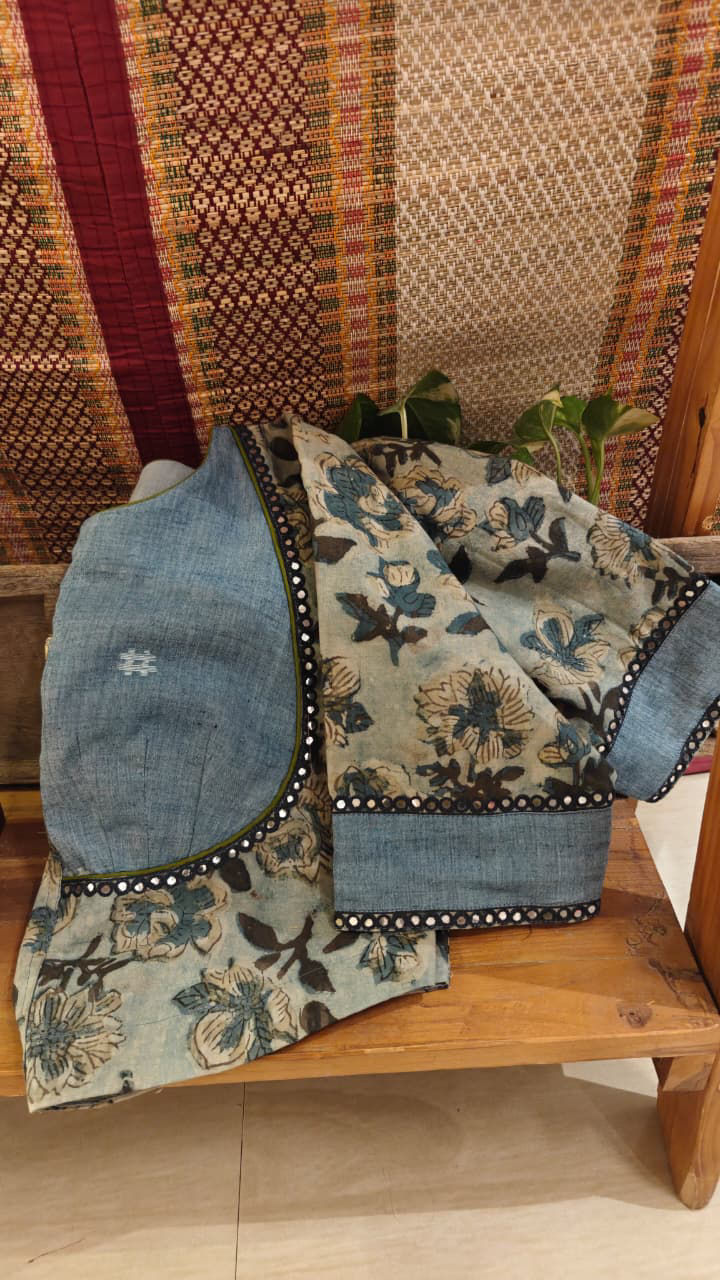 Hand block prints meet a beautifully crafted Bhopali yoke in delicate Jamdani weave, creating a rich play of texture and tradition on breathable cotton. The yoke is gently lined with mirrors, adding just the right glint without overwhelming the craft. Rooted in heritage yet easy to wear, this piece brings together multiple techniques in a way that feels balanced, thoughtful, and distinctly Svasa.