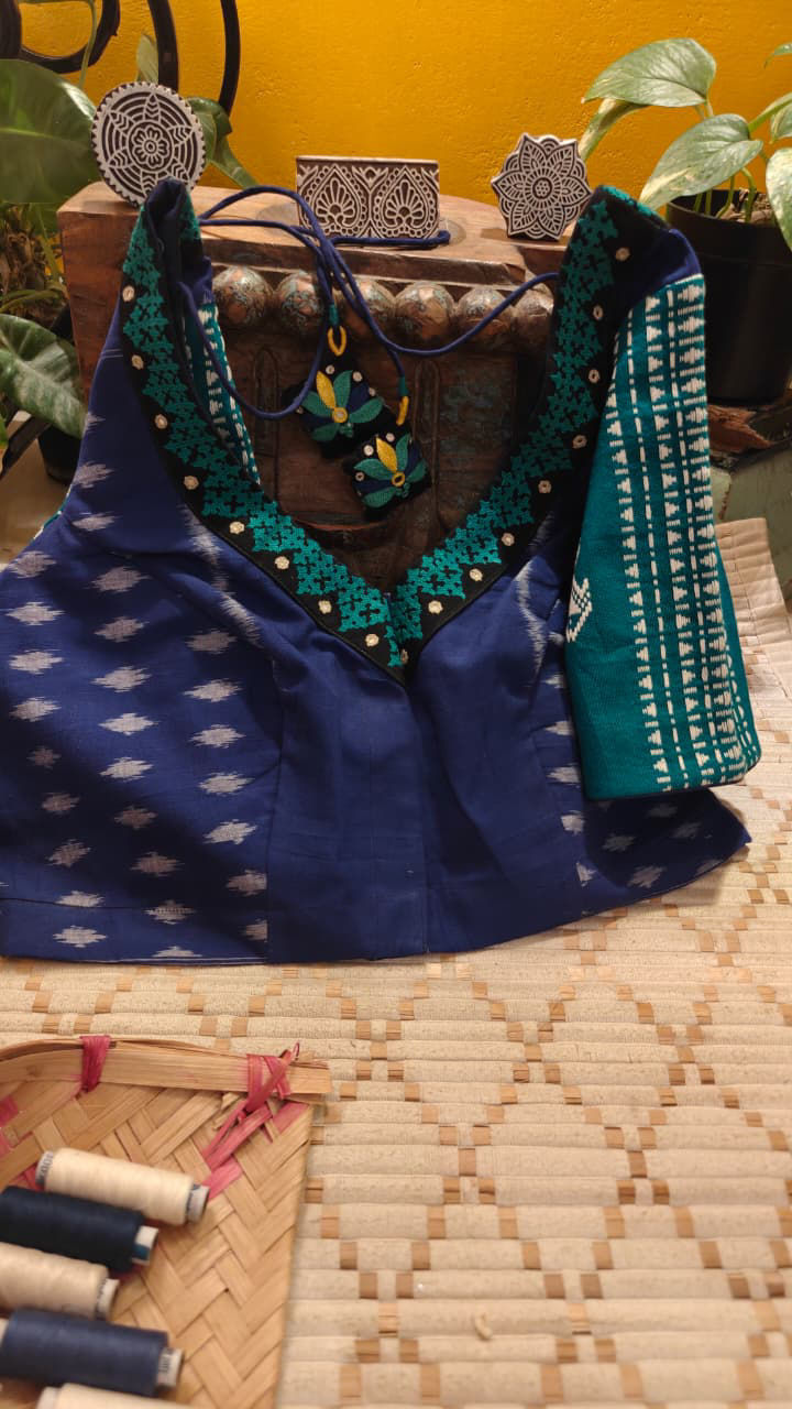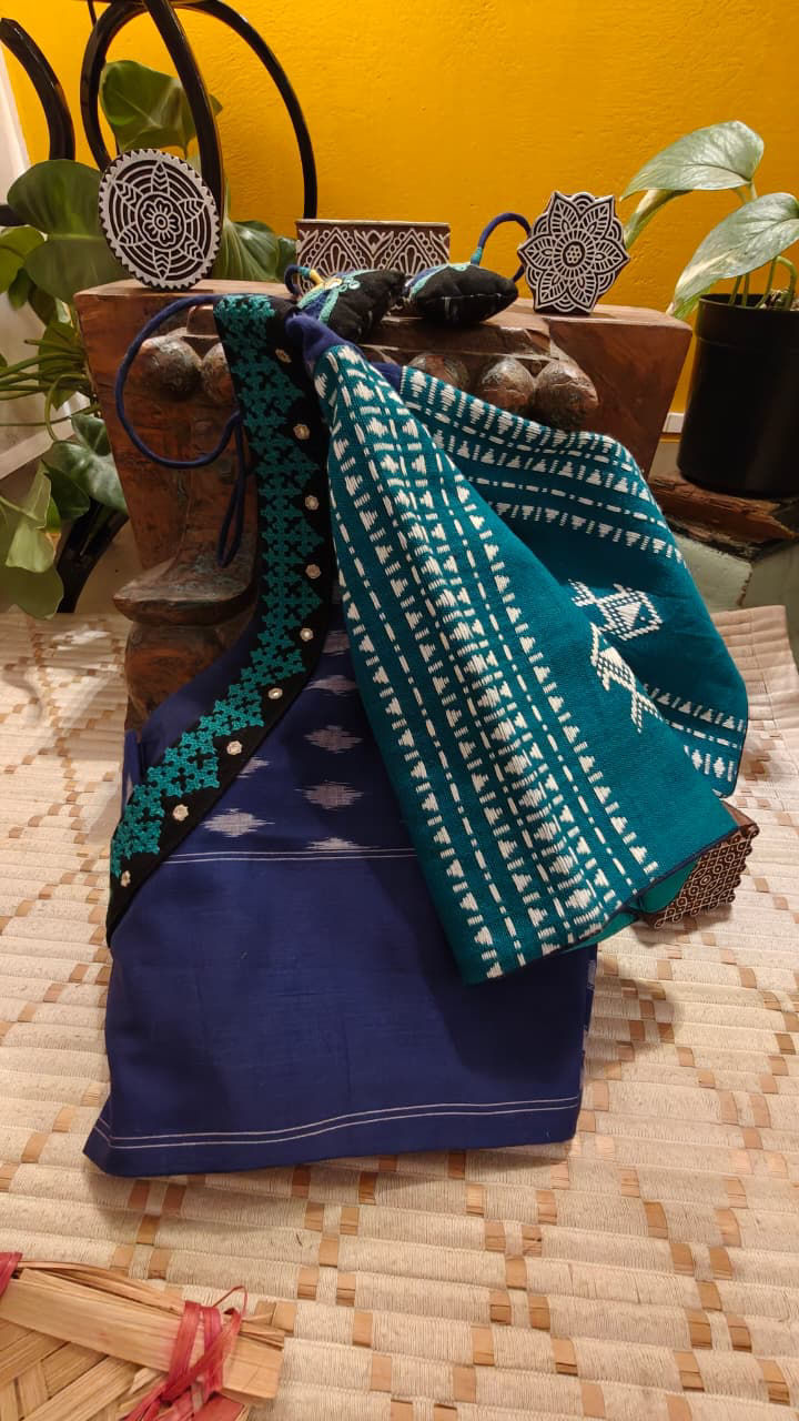 A beautiful blend of blue and sea green from our Bhumi edit, brought alive with intricate kutch work. Rooted in earthy textures yet vibrant in expression, this piece carries the spirit of handcrafted detail in every thread—bold, soulful, and quietly striking.