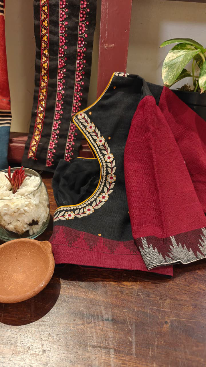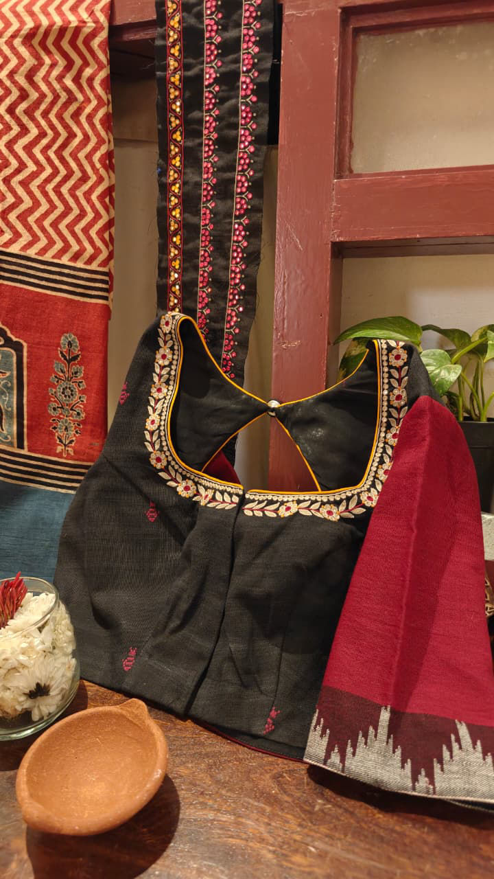 Our artisans creatively hand embroider, hand paint and hand print the blouses that come to you from the design house of SVASA. We use hand woven fabric extensively. You may notice very minute, almost insignificant flaws in the crafts since they are all handmade. We urge our patrons to overlook a few human errors that may have occurred in the process. Our aspirations are towards an empowered society, focusing on keeping traditional needlecraft alive for a long time to come.