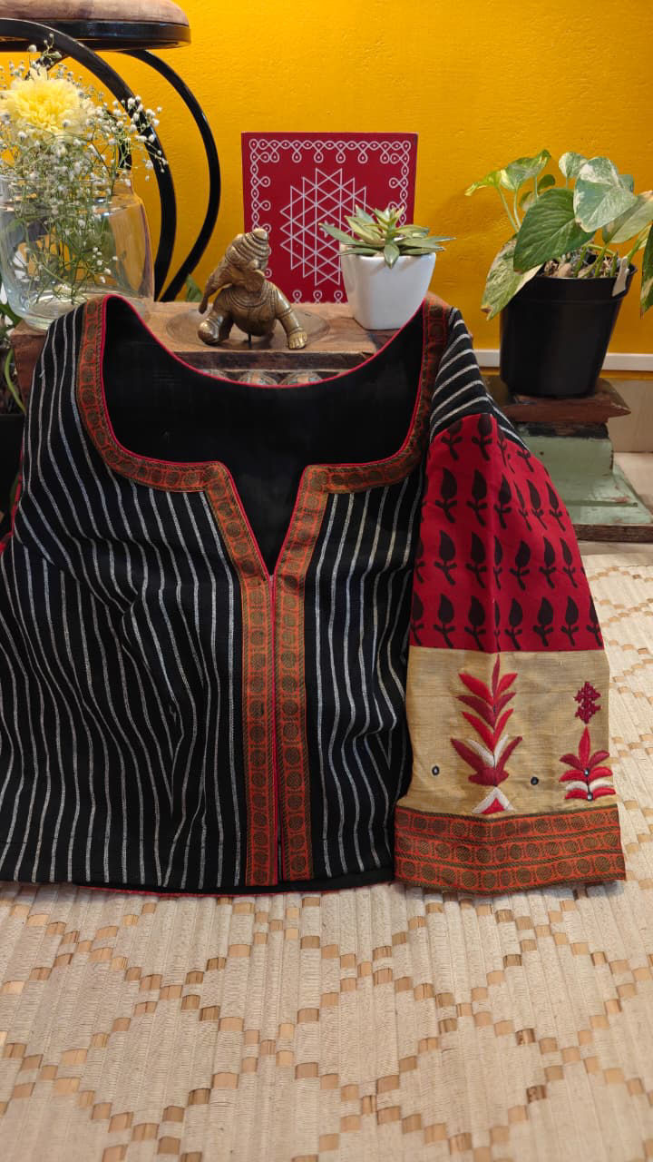 Striking Kotpad stripes in black and ivory form the base of this cotton blouse, bringing with them the earthy character of this tribal weave. Embroidered tribal borders and block printed details add layers of craft and texture, creating a piece that feels rooted, bold and beautifully handmade.