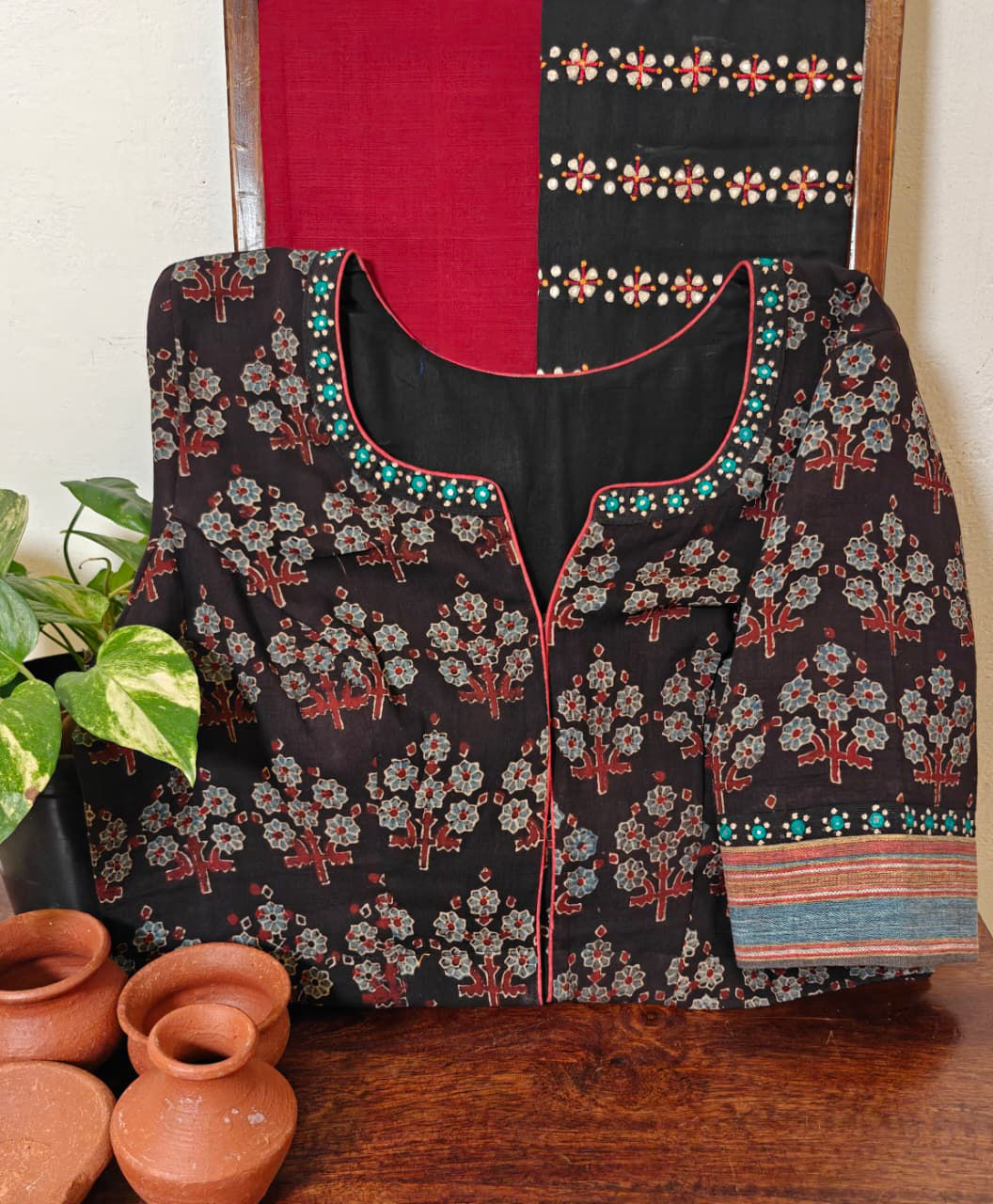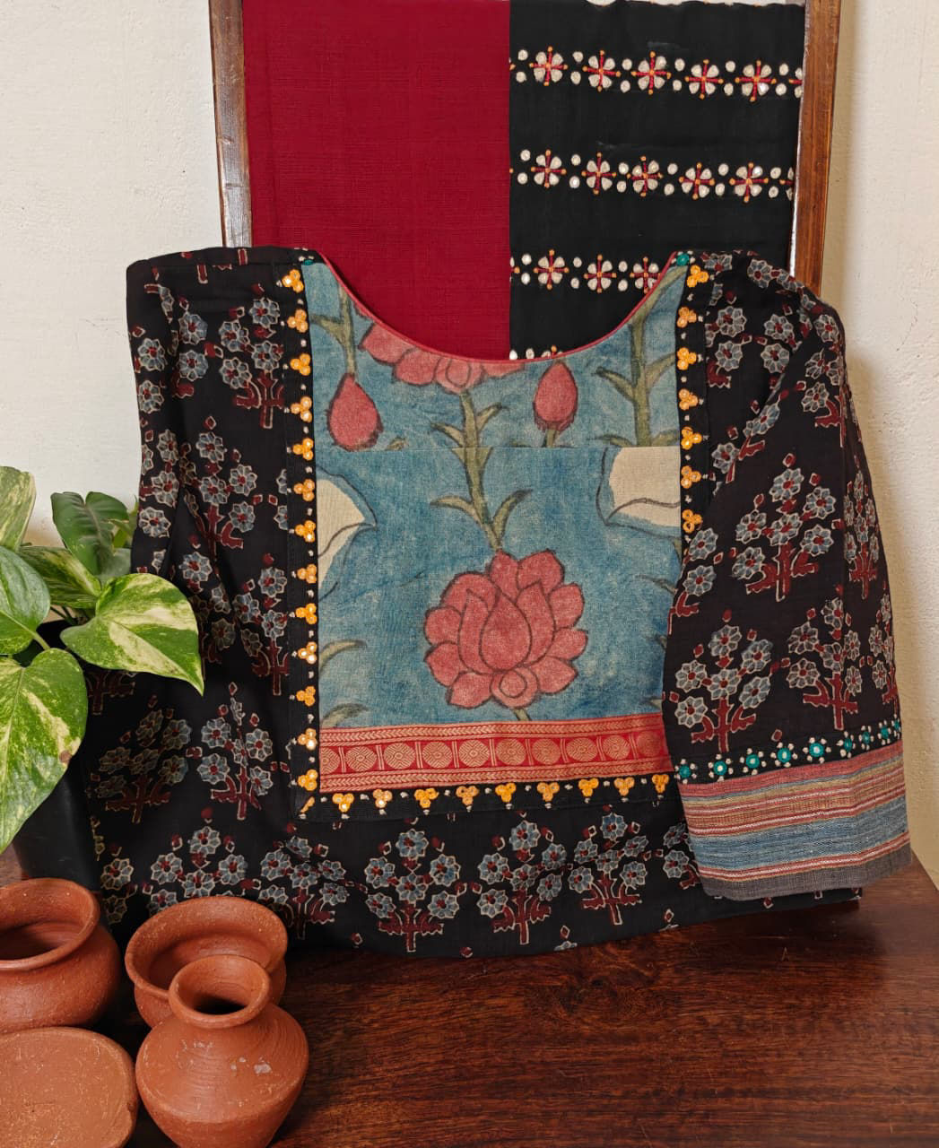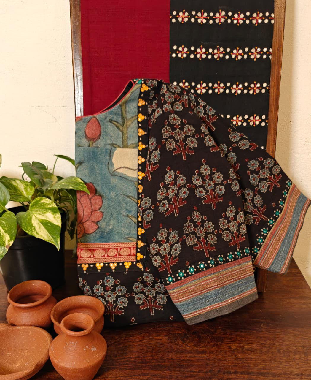 A cotton blouse with a striking blue kalamkari yoke on a block-printed base 🌿. Mukatti mirrors line the borders ✨ creating a rare mix of tradition and artistry — handmade, only at Svasa. 🪡💫