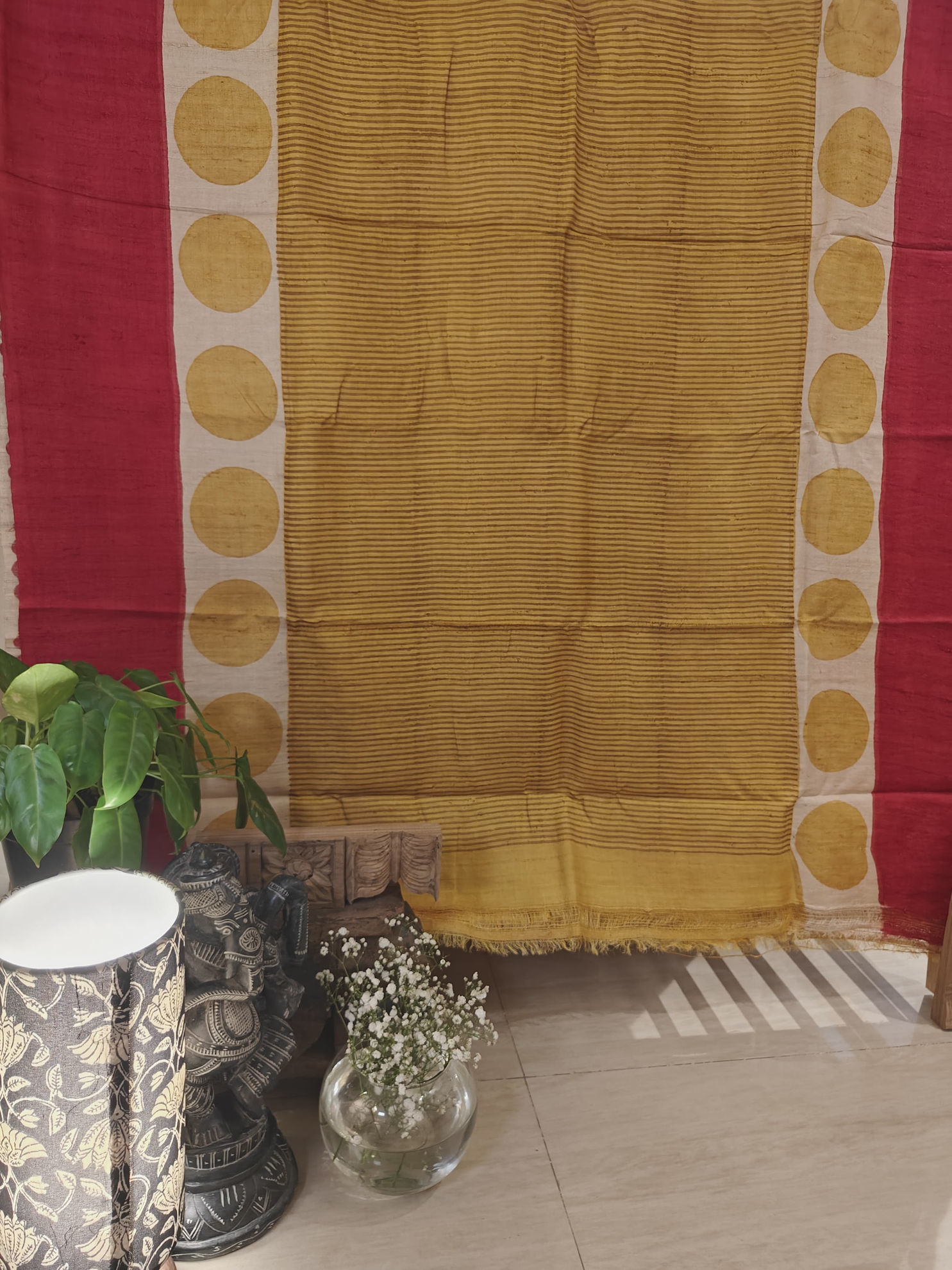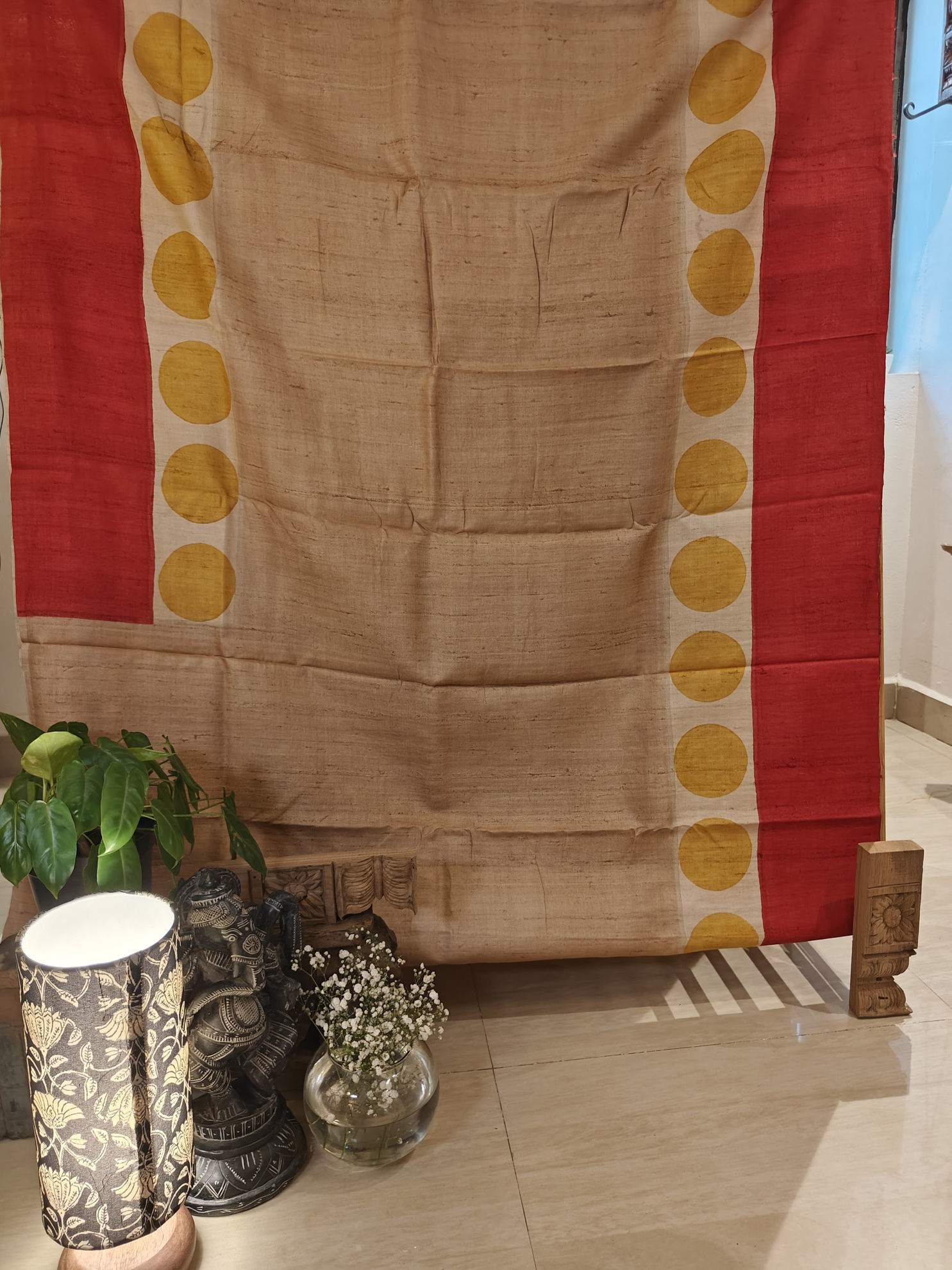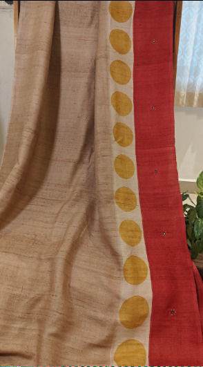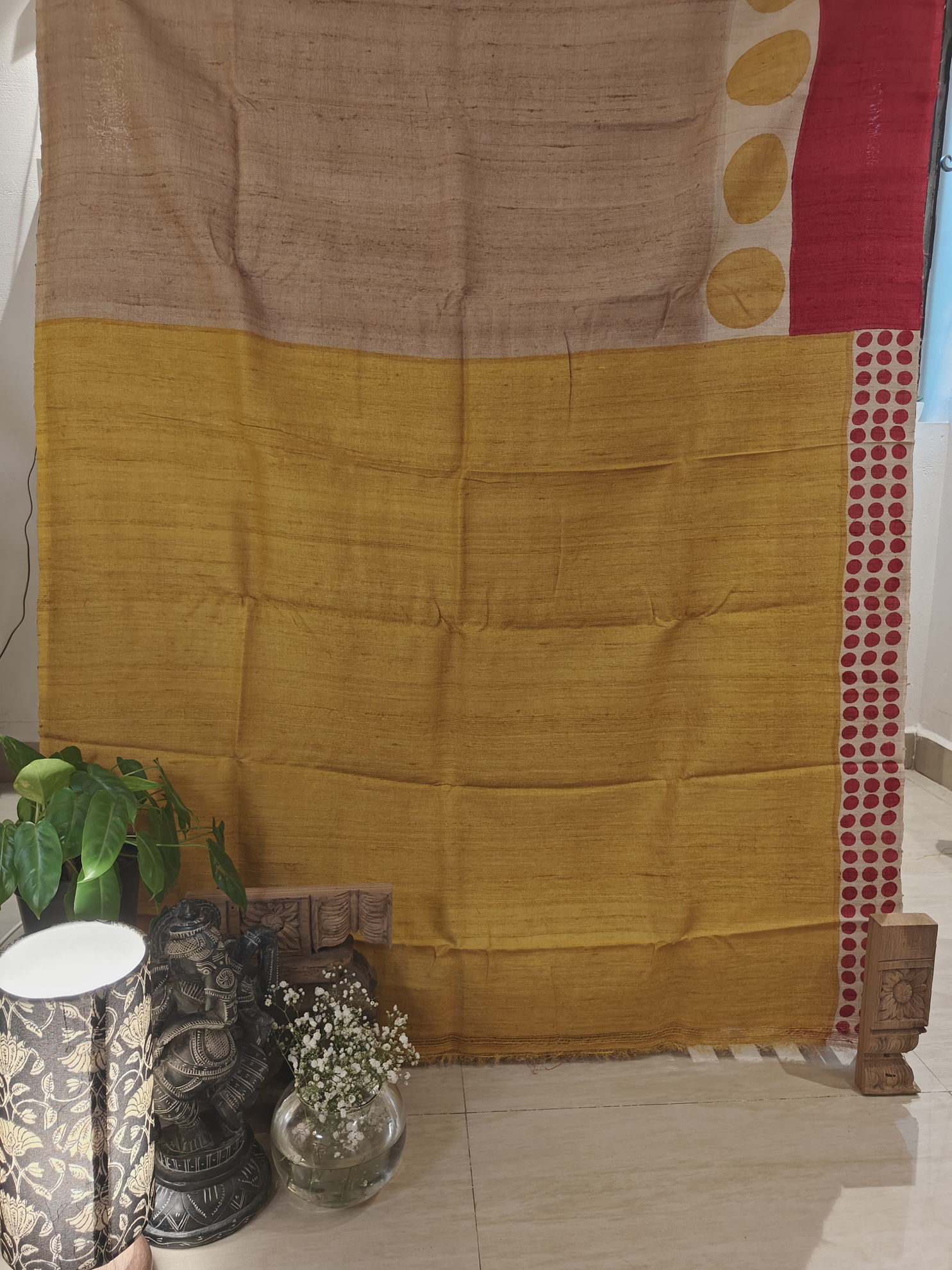 A classic tussar silk, hand block printed and layered with bold floral appliqué and delicate embroidery. A statement piece that’s both traditional and striking. We’ve paired it with a stitched blouse for styling inspiration and included an unstitched blouse for your imagination. Please note: stitched blouse is priced separately.