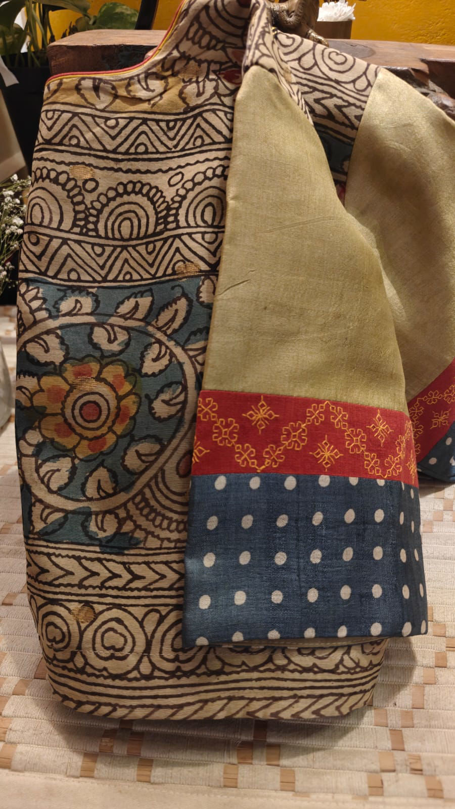 Delicate Kalamkari narratives meet the airy grace of Chanderi, enriched with intricate Kasuti embroidery that lends rhythm and precision to the weave. Rooted in tradition yet effortlessly refined, the fine handwork traces timeless motifs across the fabric, creating a piece that feels light, artistic, and quietly elegant — a celebration of heritage crafts coming together in harmony.