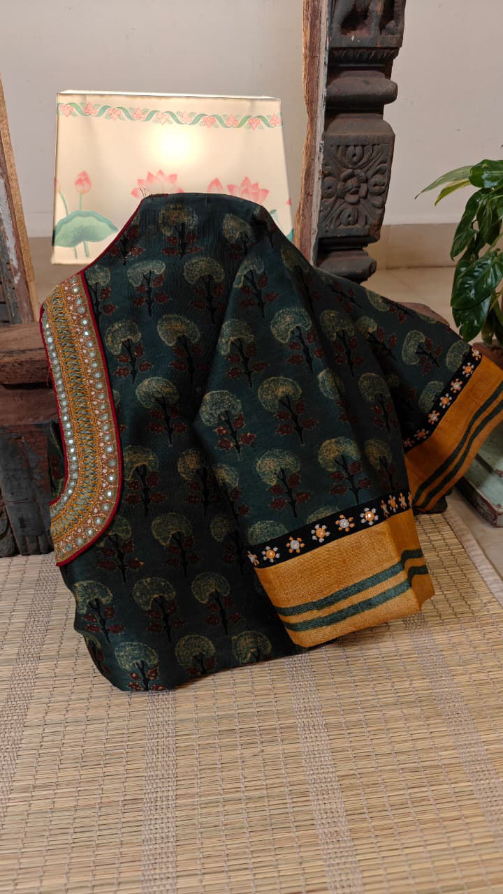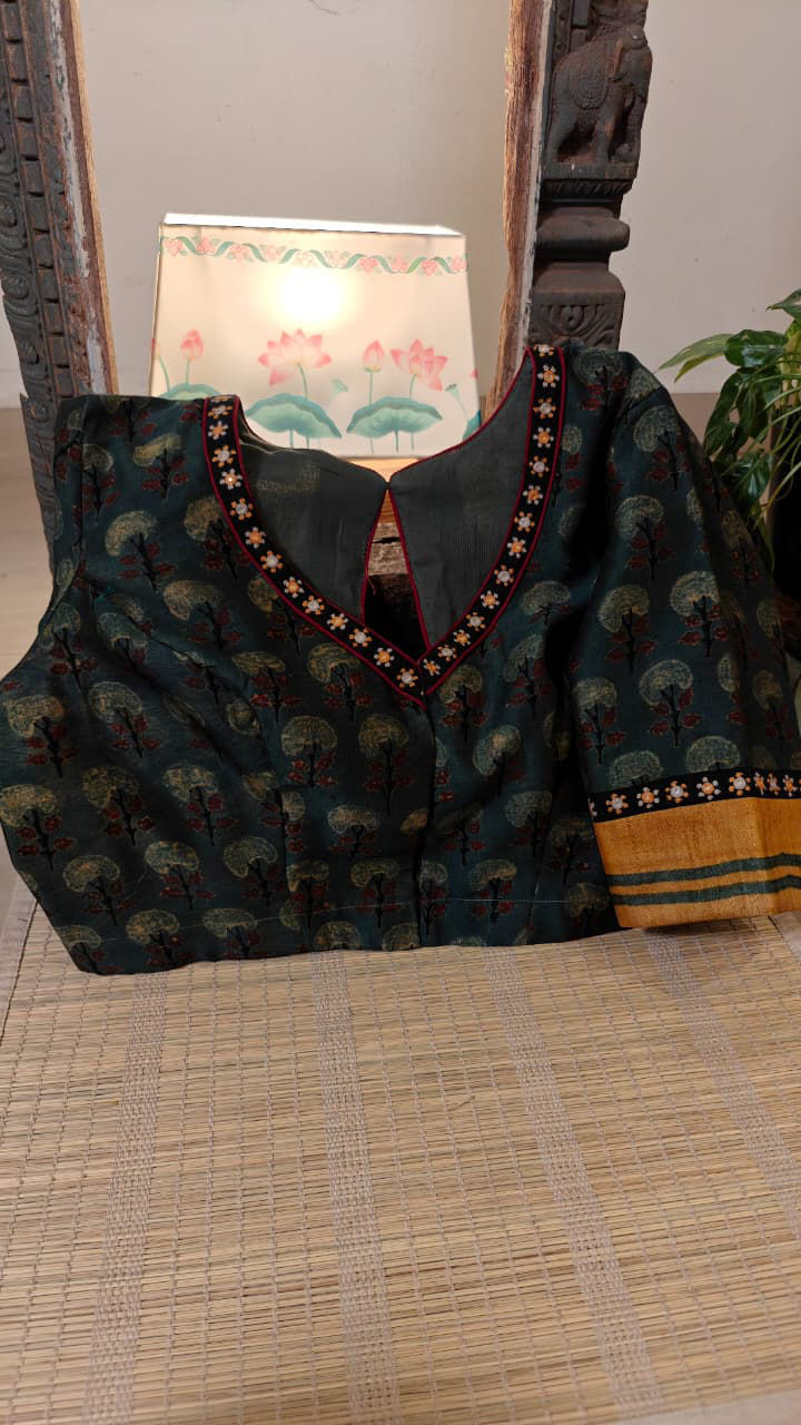 Block-printed Chanderi, adorned with vintage embroidery that speaks of timeless artistry. A classic handmade creation from Svasa. 🌿πŸͺ‘