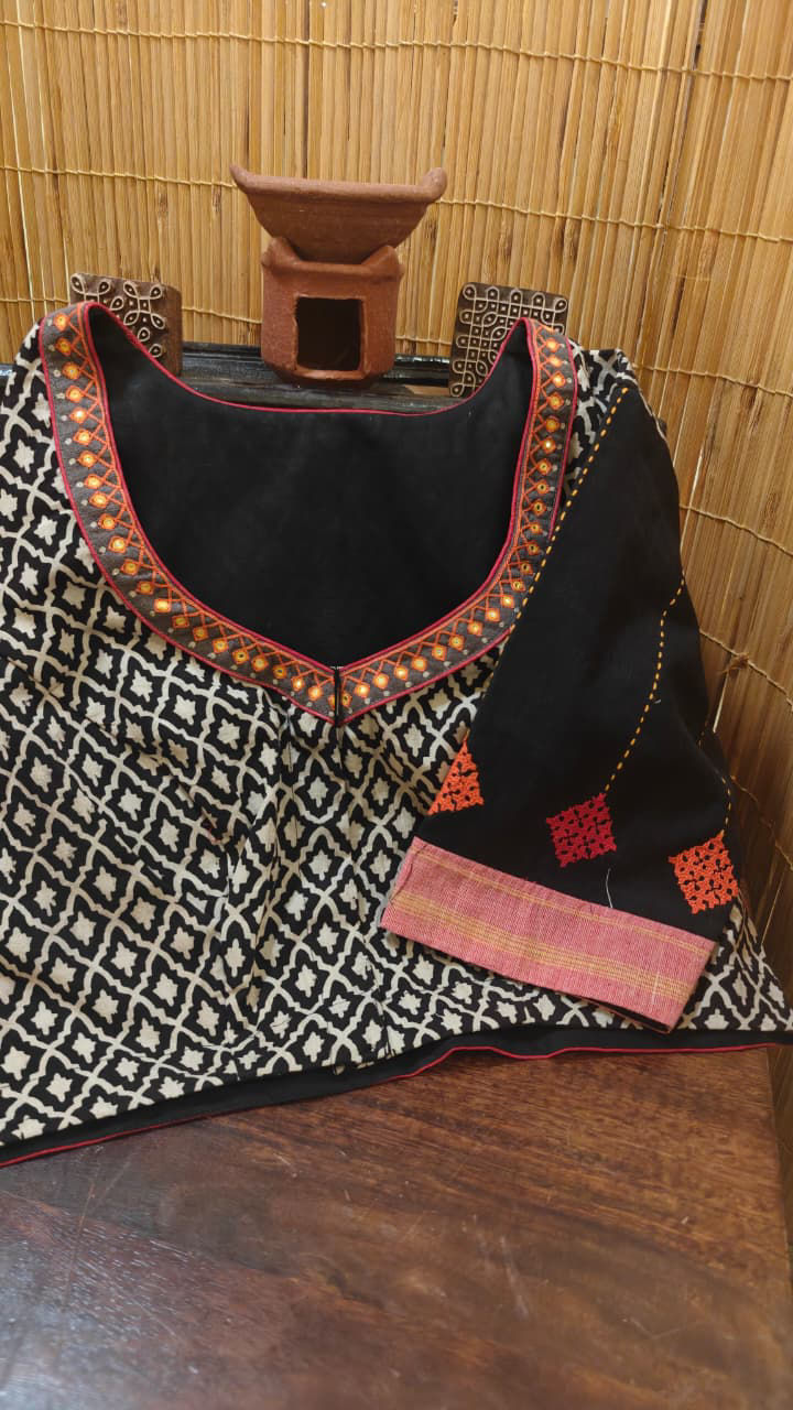 Block printed in black and ivory, held together with plain charcoal sleeves that bring a sense of calm depth. Kutchi embroidery adds just the right note of texture—earthy, detailed, and quietly striking. A piece that settles into you… understated, yet full of character.