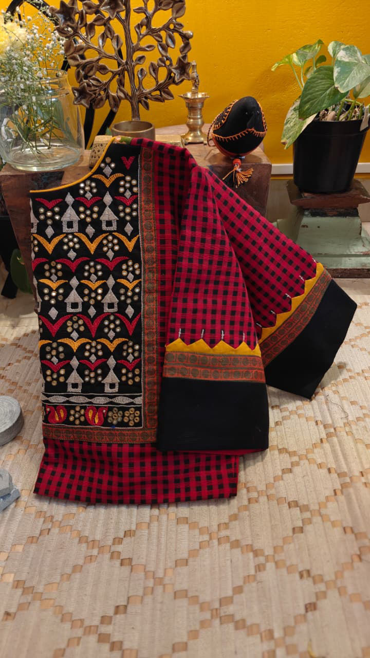 Handloom cotton in classic charcoal checks, brought to life with bold tribal embroidery that adds a striking touch to the simplicity of the weave. Rooted in craft and character, this blouse carries the quiet strength of handloom with the vibrancy of tribal artistry — a beautiful meeting of tradition and texture.