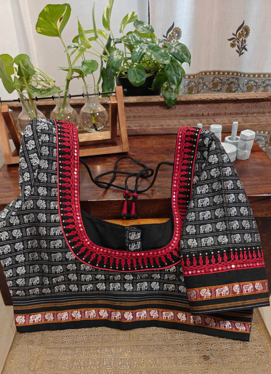A stunning Khun cotton blouse in charcoal and ivory, brought to life with chilli red embroidery. Earthy tones, bold details—woven tradition with a modern edge.