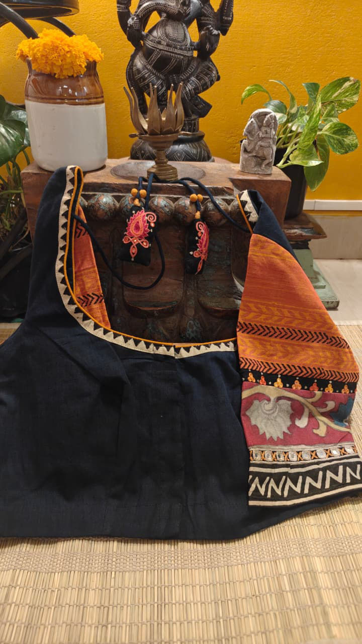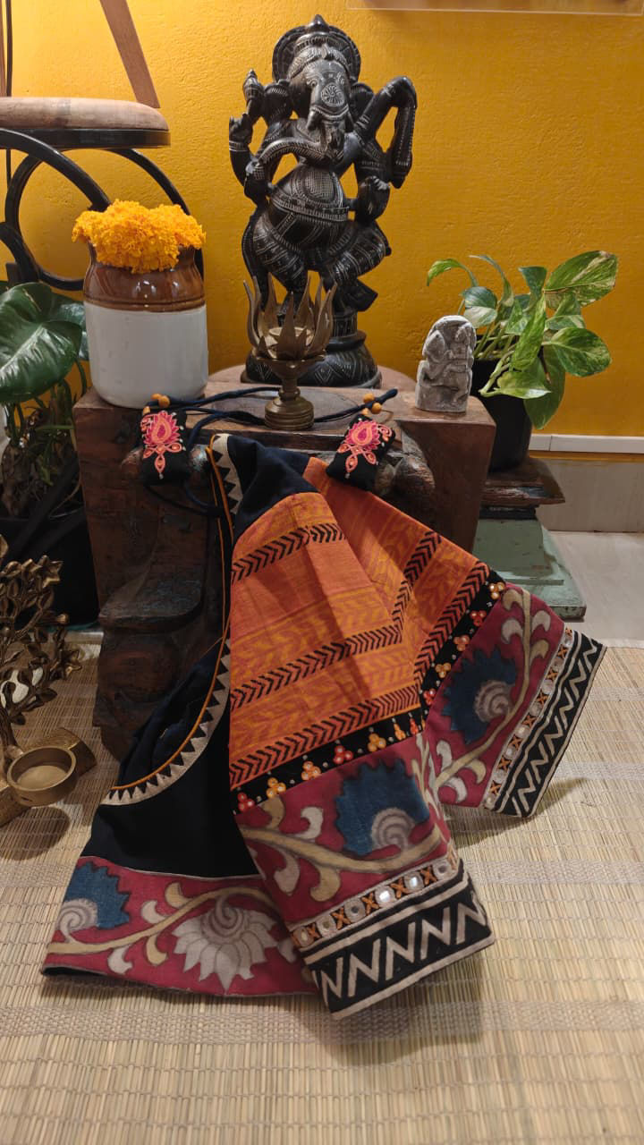 A deep charcoal base brought alive with Kalamkari, layered over a thoughtful fusion of weaves. The interplay of textures and craft creates a piece that feels grounded yet distinctive—quietly rich, detailed, and full of character.