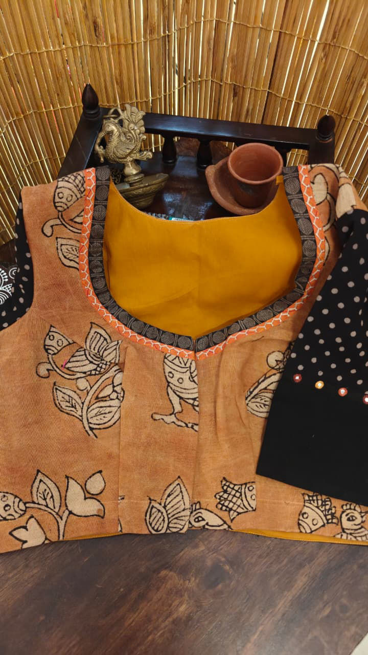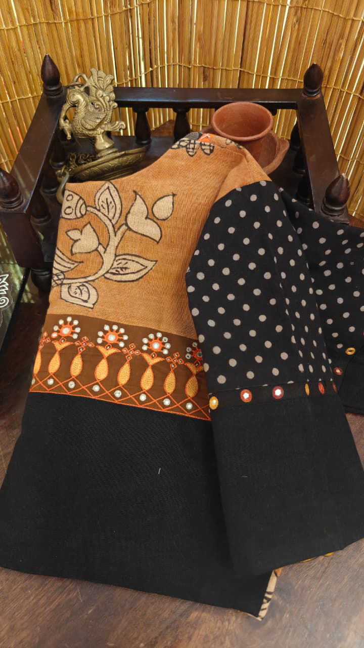 Charcoal meets the storytelling of Kalamkari, framed with a border inspired by tribal rhythms. A beautiful interplay of narrative and pattern, where earthy traditions come together with quiet strength, creating a piece that feels rooted, artistic, and distinctly Svasa.