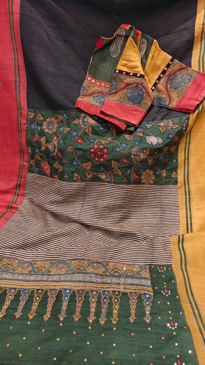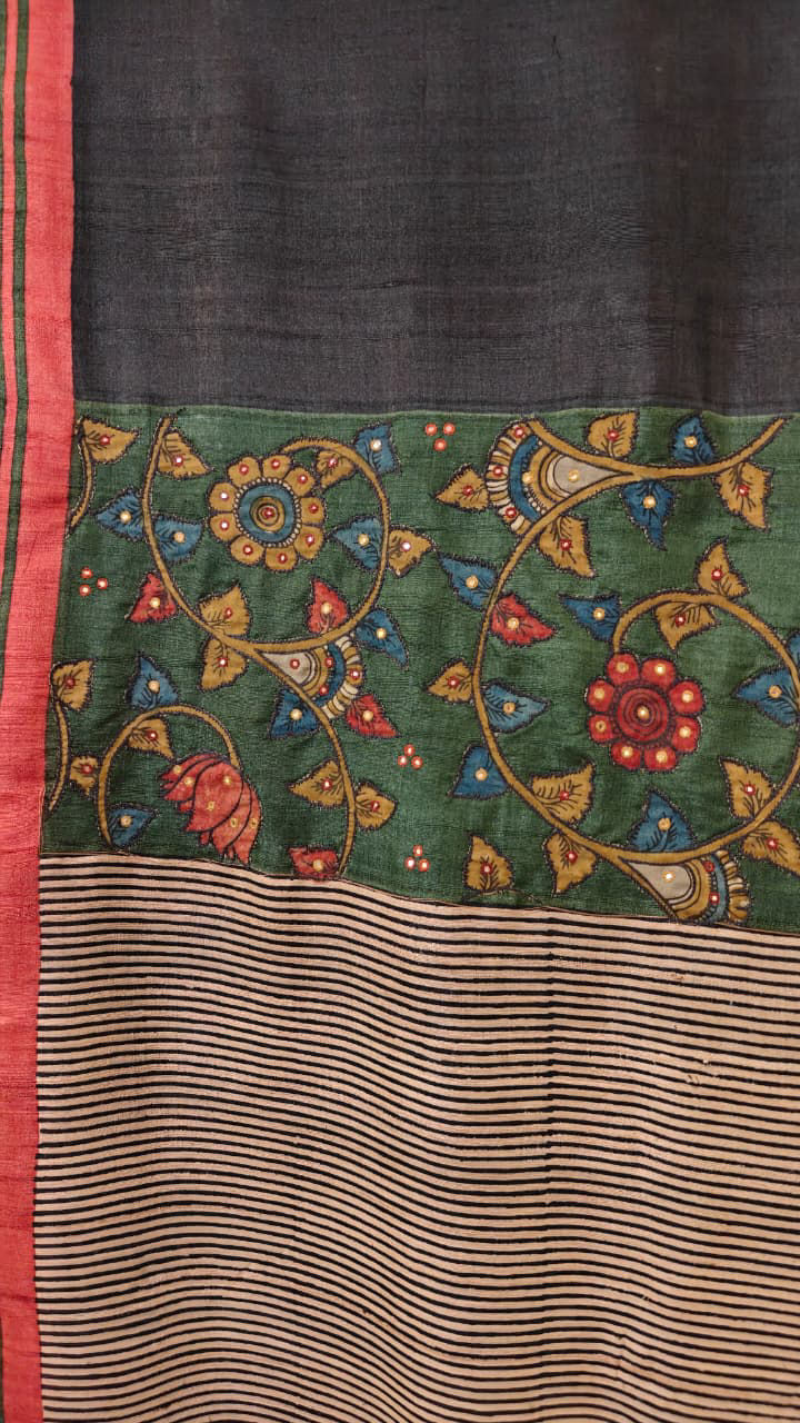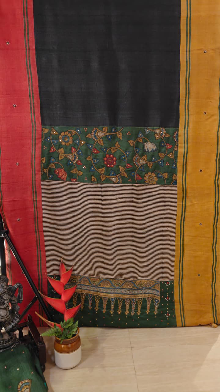 A rich charcoal base in pure tussar silk sets the tone for this striking piece, where heritage craft meets thoughtful design. The yoke is adorned with hand-appliquéd Kalamkari, embroidered delicately to bring the motifs alive with texture and depth. Framing it beautifully are Ganga Jamuna accents in vibrant yellow and red — a classic interplay of colour that lends both warmth and character.