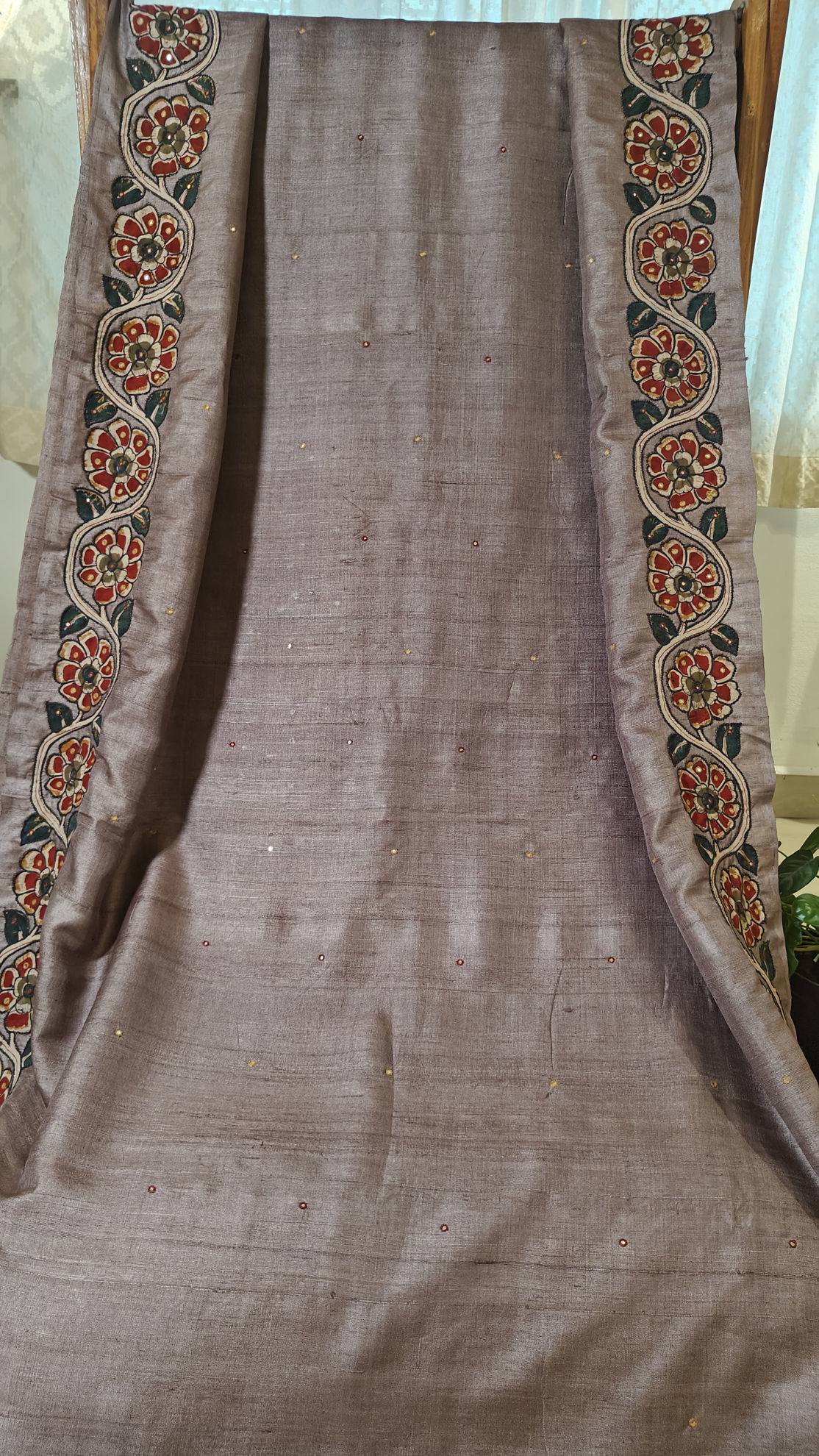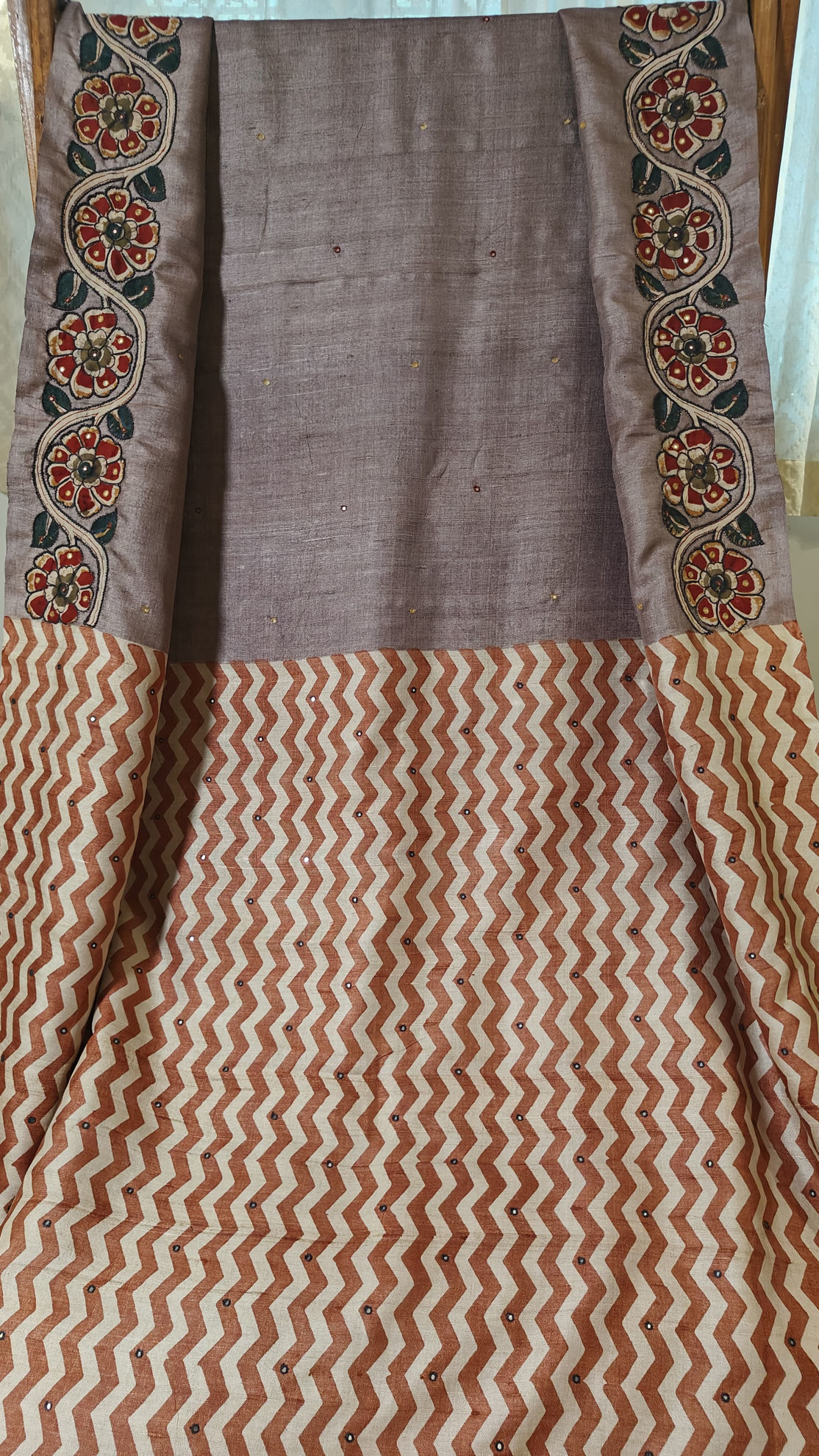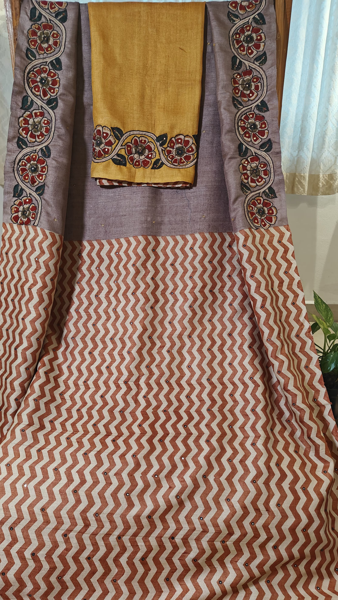 A soft light brown Tussar silk, brought to life with chevron block prints in vibrant orange and ivory on the pallu. The borders — a canvas of meticulous hand-appliquéd Kalamkari, painted by skilled hands, every curve telling a story. Paired with a bright canary yellow blouse embroidered to echo the tones of the saree — this Mithra is a collectible.