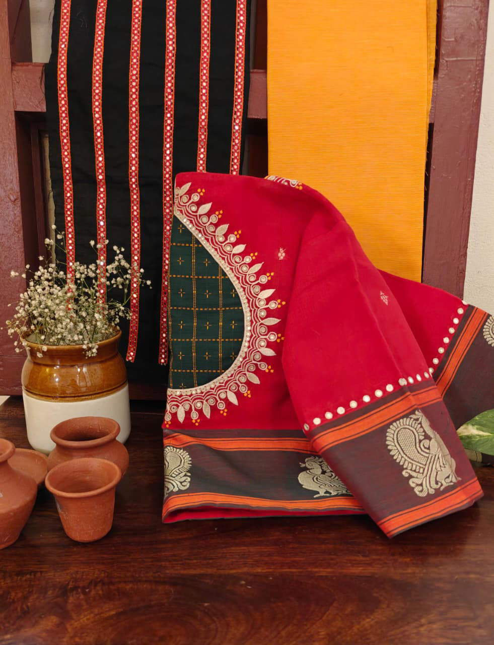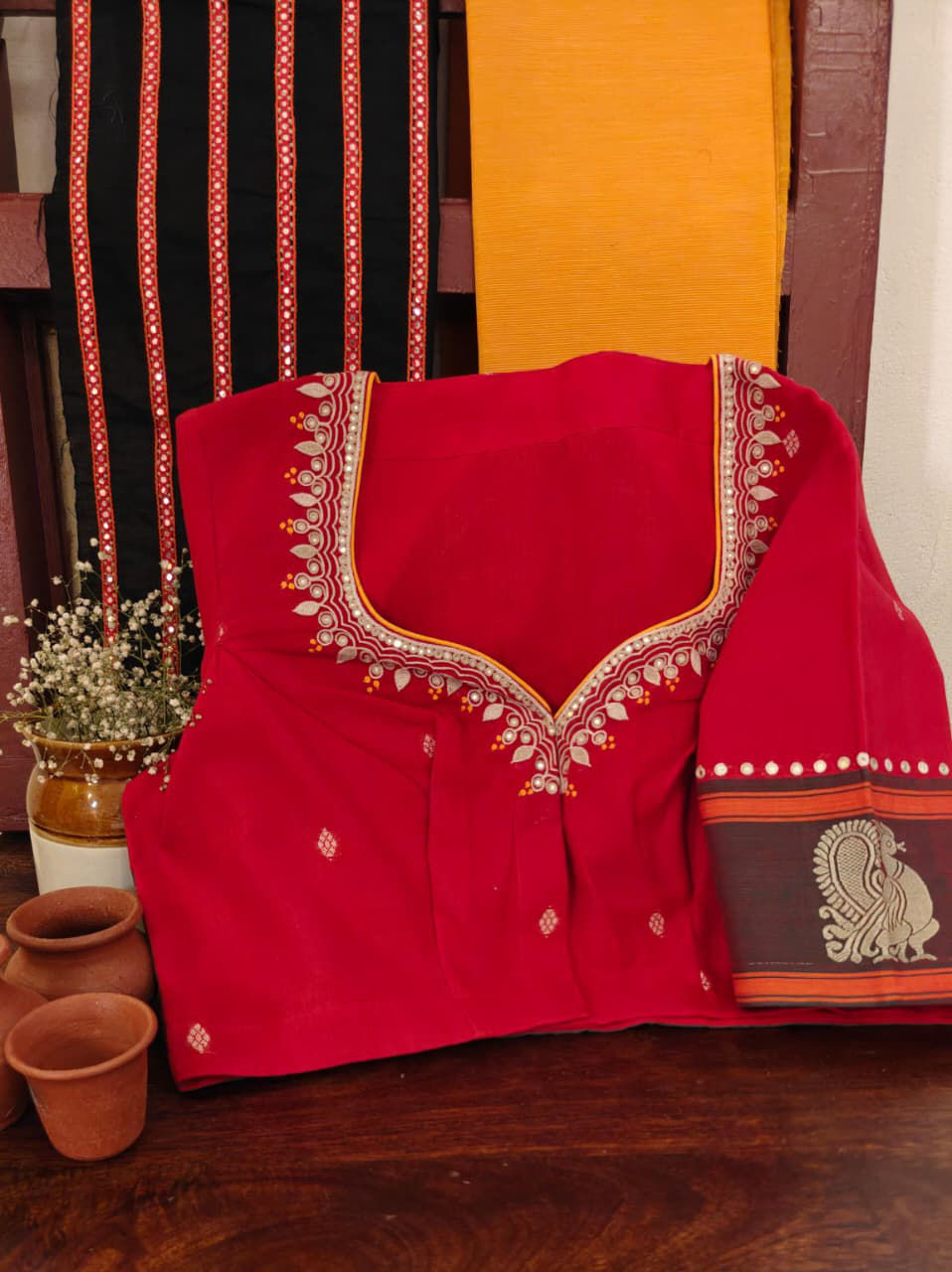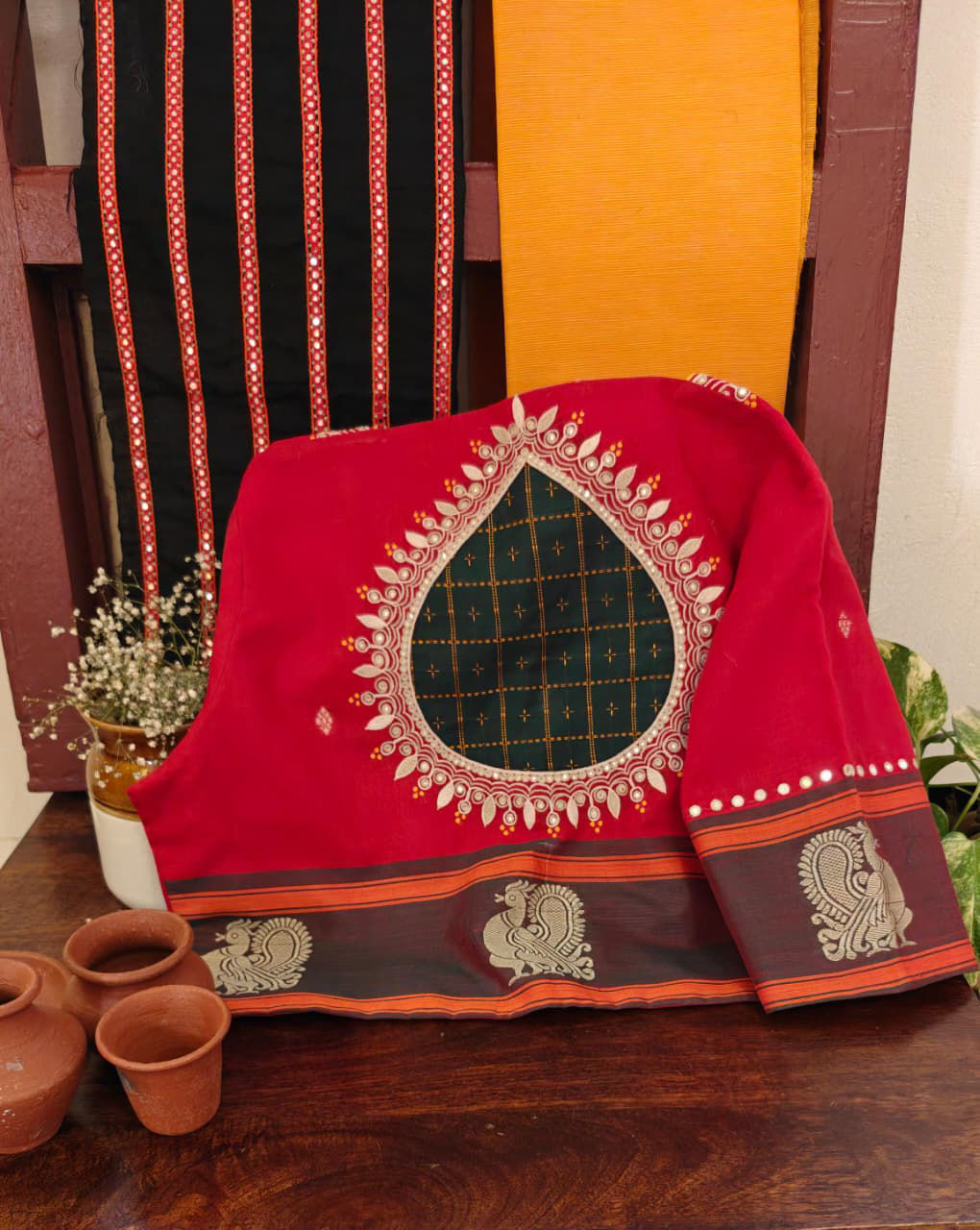 A red Kanchi cotton weave forms the base — rich in story, humble in feel. An ivory embroidery border wraps around a traditional yoke carrying graceful Annam motifs. This blouse is woven in the iconic Kandangi cotton variant, known for its durability and character. A delicate play of red with ivory threadwork and Annams gently highlighted at the back and sleeves makes this a classic Svasa drop for festive wardrobes — confident, rooted, unmistakable.