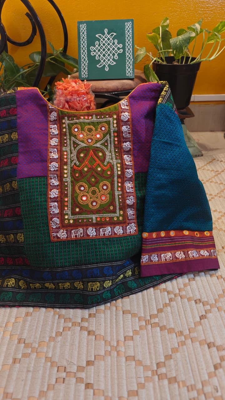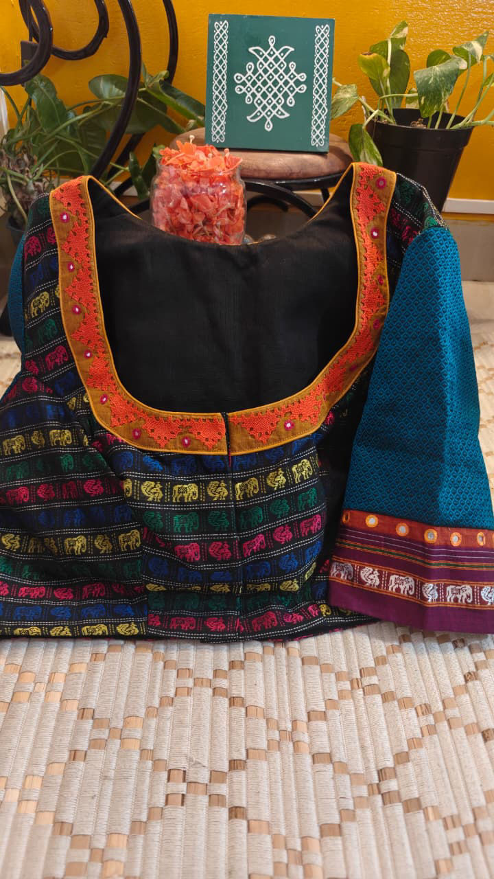 Our artisans creatively hand embroider, hand paint and hand print the blouses that come to you from the design house of SVASA. We use hand woven fabric extensively. You may notice very minute, almost insignificant flaws in the crafts since they are all handmade. We urge our patrons to overlook a few human errors that may have occurred in the process. Our aspirations are towards an empowered society, focusing on keeping traditional needlecraft alive for a long time to come.