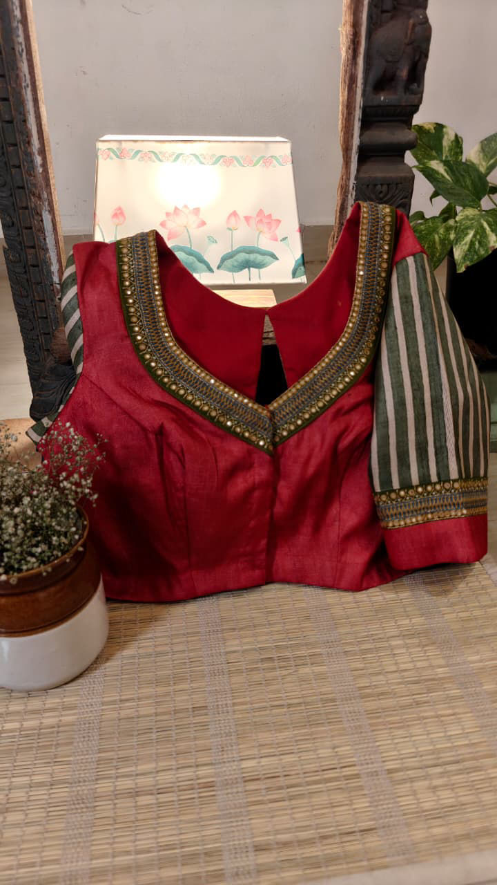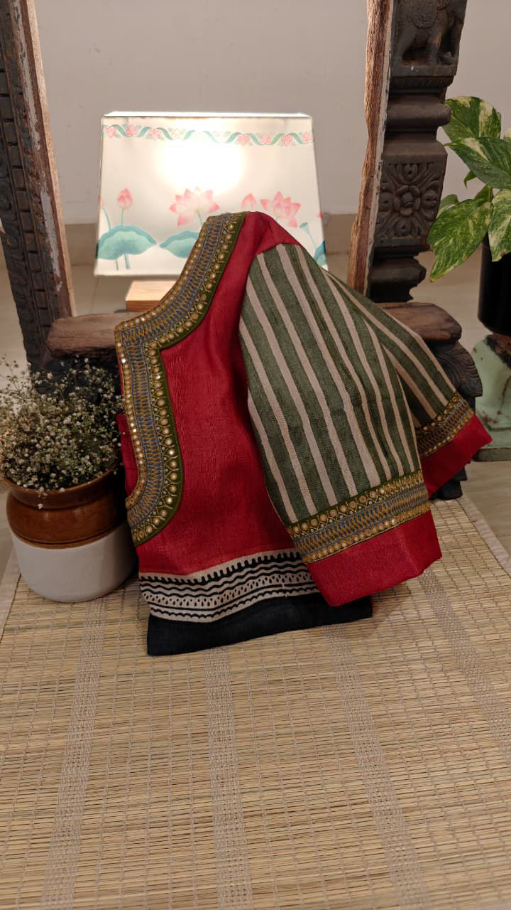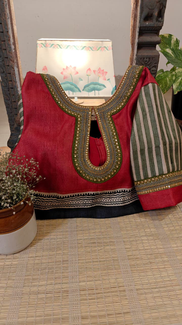 A rich deep orange silk tussar, paired with green striped sleeves—a combination that instantly feels classic. Hand block-printed and finished with vintage-hued embroidery, this piece carries that timeless charm Svasa is known for. A blouse that stands bold, warm, and beautifully crafted.