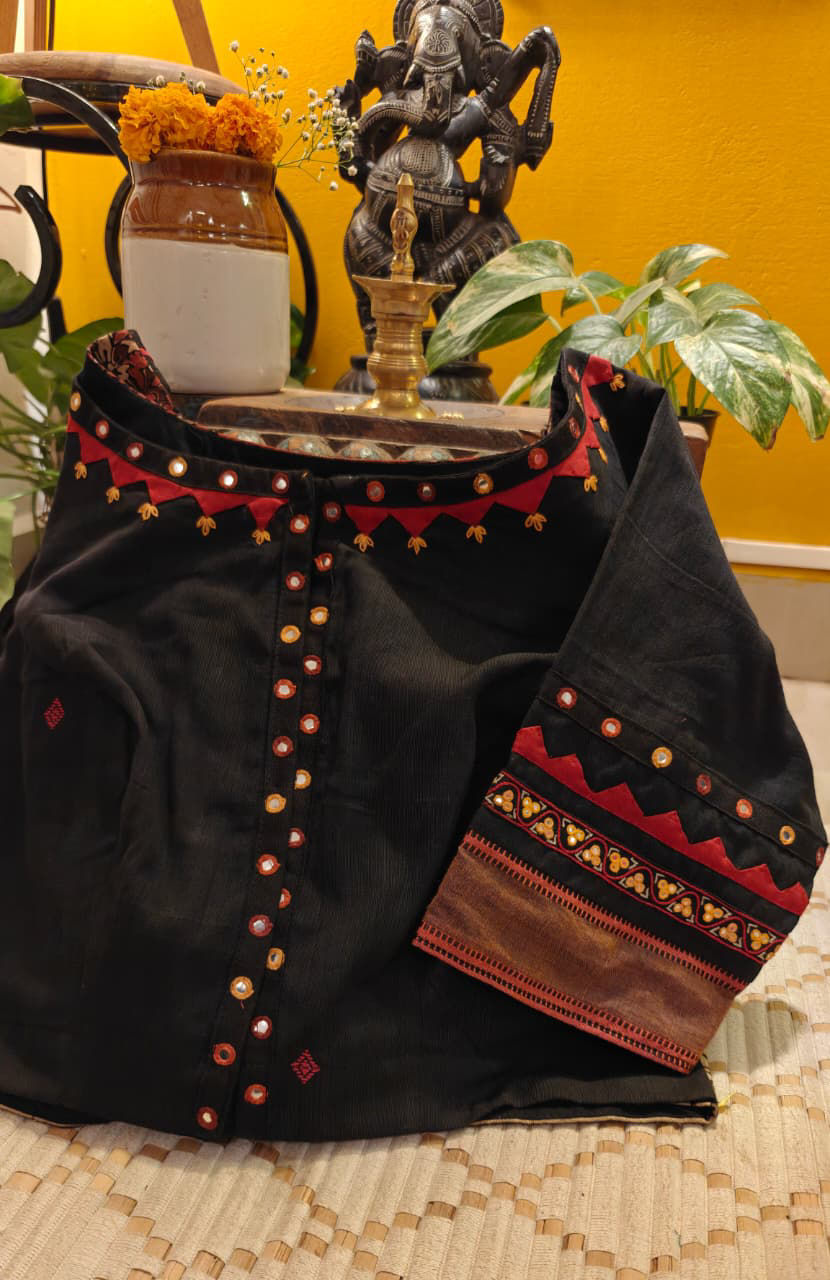 Our artisans creatively hand embroider, hand paint and hand print the blouses that come to you from the design house of SVASA. We use hand woven fabric extensively. You may notice very minute, almost insignificant flaws in the crafts since they are all handmade. We urge our patrons to overlook a few human errors that may have occurred in the process. Our aspirations are towards an empowered society, focusing on keeping traditional needlecraft alive for a long time to come.