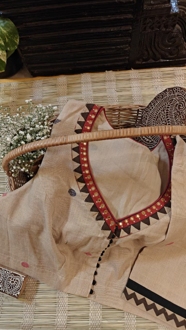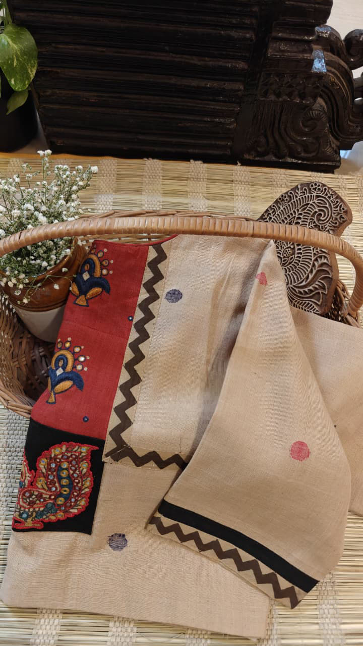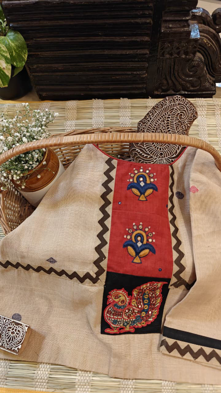 A warm beige cotton base brought alive with madder tones and a quiet dash of black. Tribe-inspired motifs and clusters of mirrors add rhythm and depth, echoing stories of the land. Handloom cotton, handcrafted with character — a soulful Svasa creation.