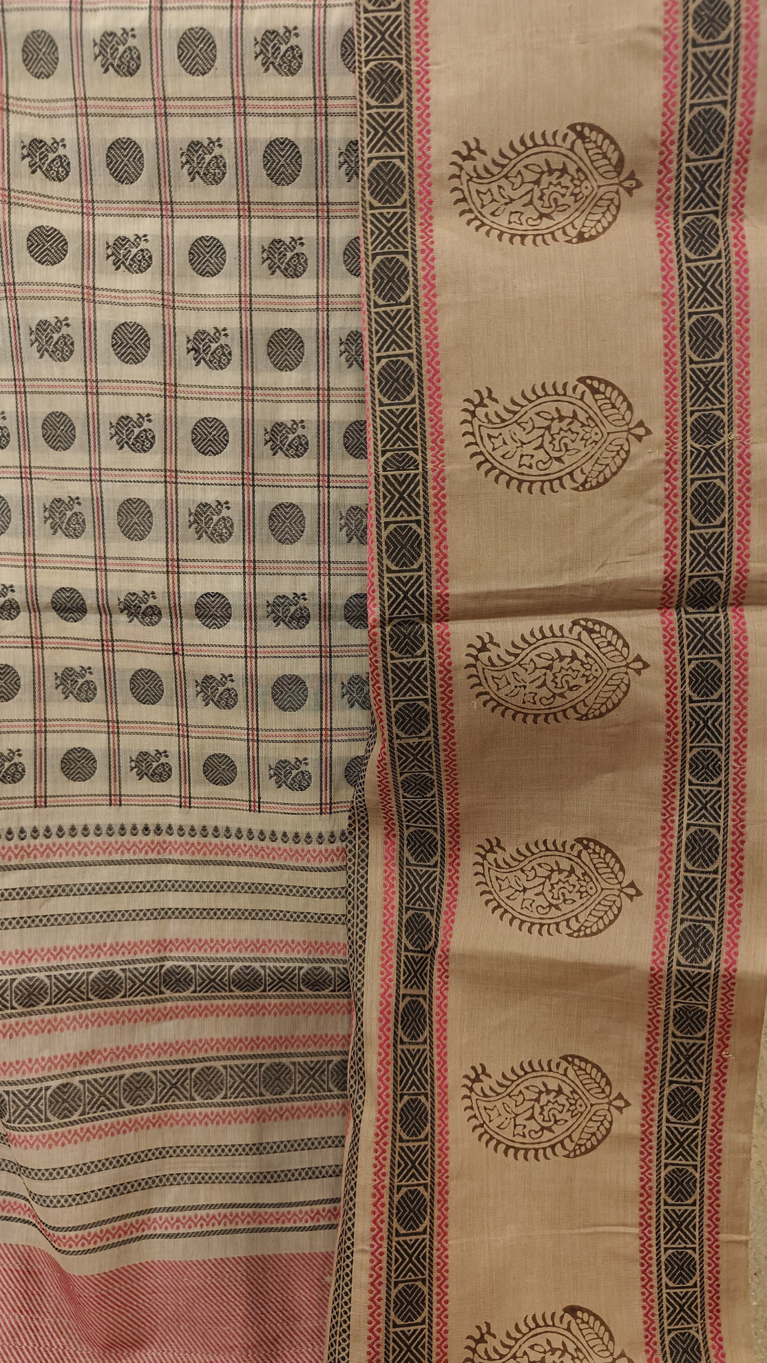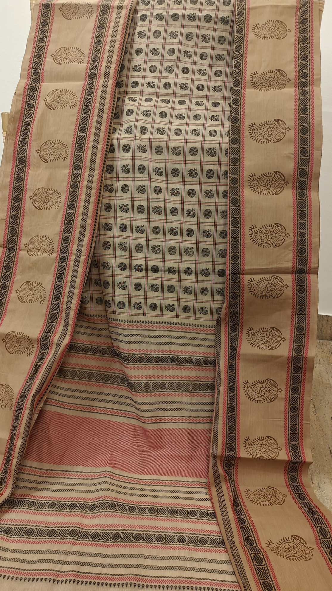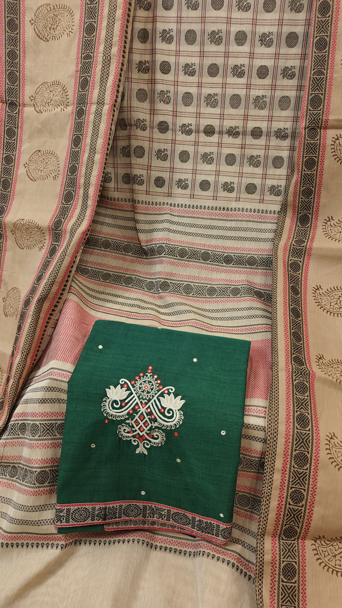 A rich airam butta Kanjivaram cotton saree in chocolate brown — adorned with paisley block prints that echo tradition with every fold. Paired with an emerald green blouse, embroidered in delicate ivory threads, this set balances earthy tones with striking contrasts. A timeless Svasa combination that speaks of quiet strength and classic style.