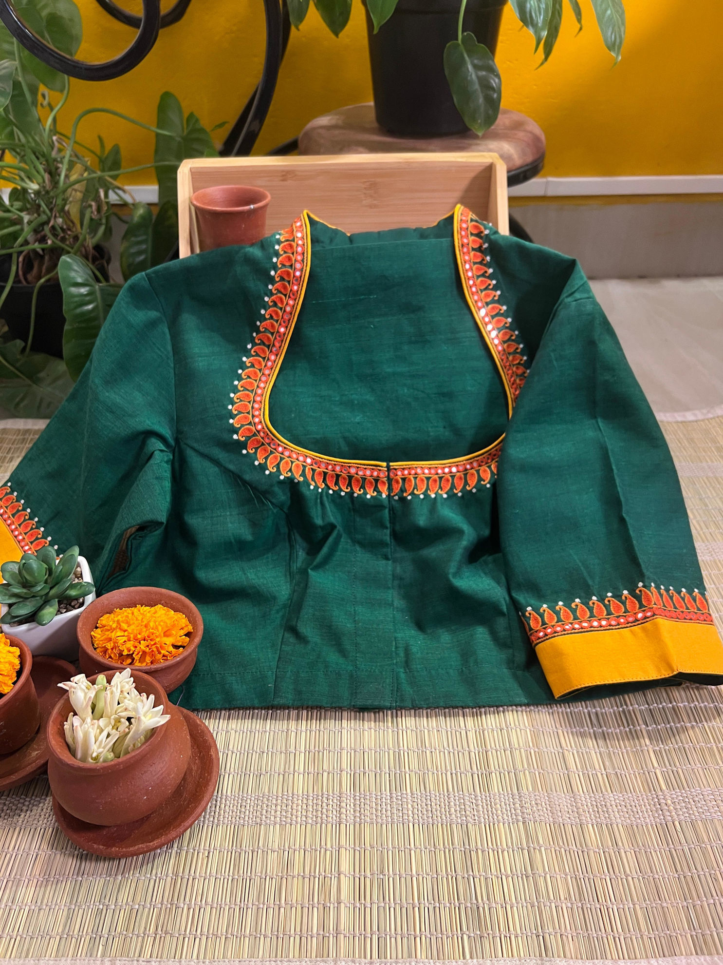Emerald green never fails—and when paired with our mutka neck, it’s a classic that always stays in style. Embroidered in vibrant shades of orange and yellow, this beauty is a timeless piece for every saree lover! A signature Svasa design that’s here to stay❤️🍁