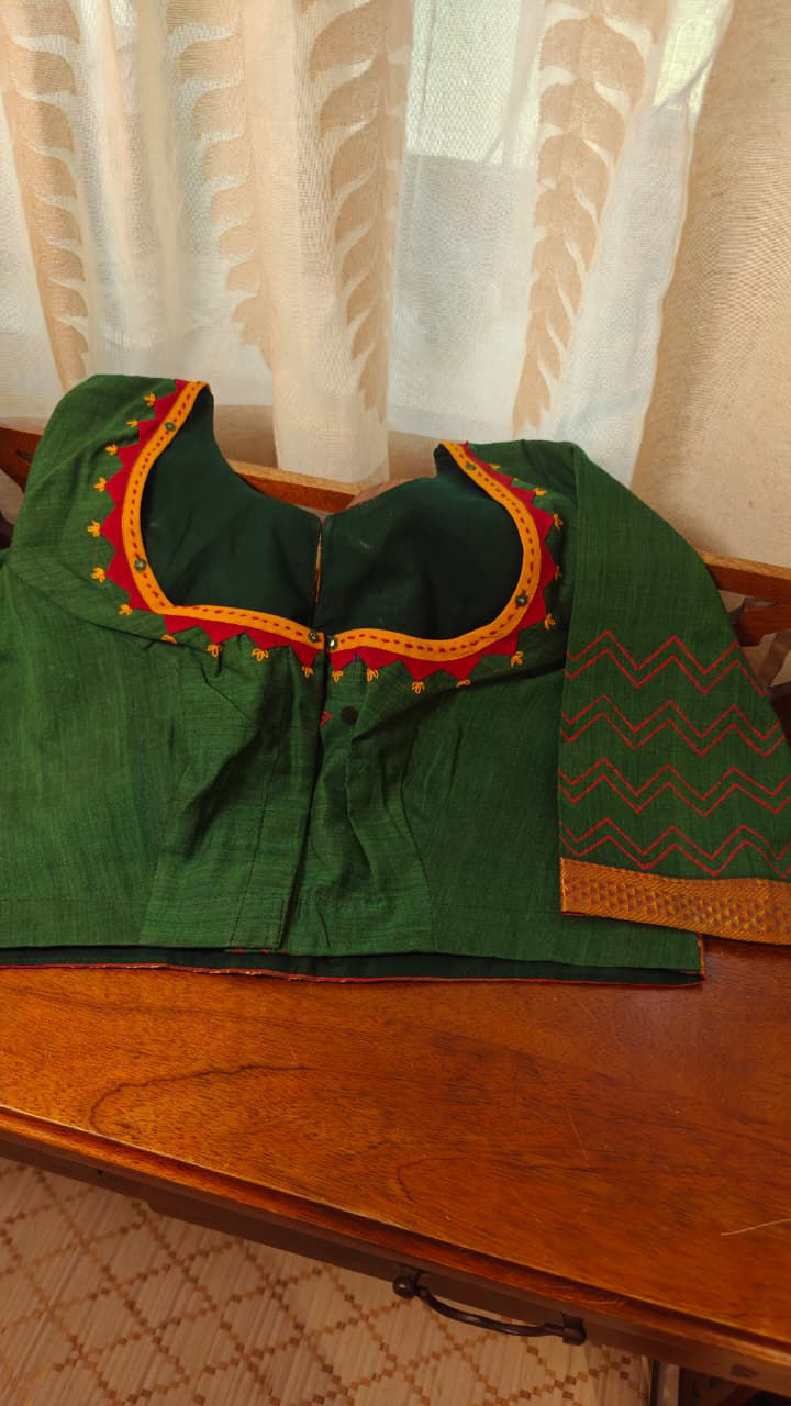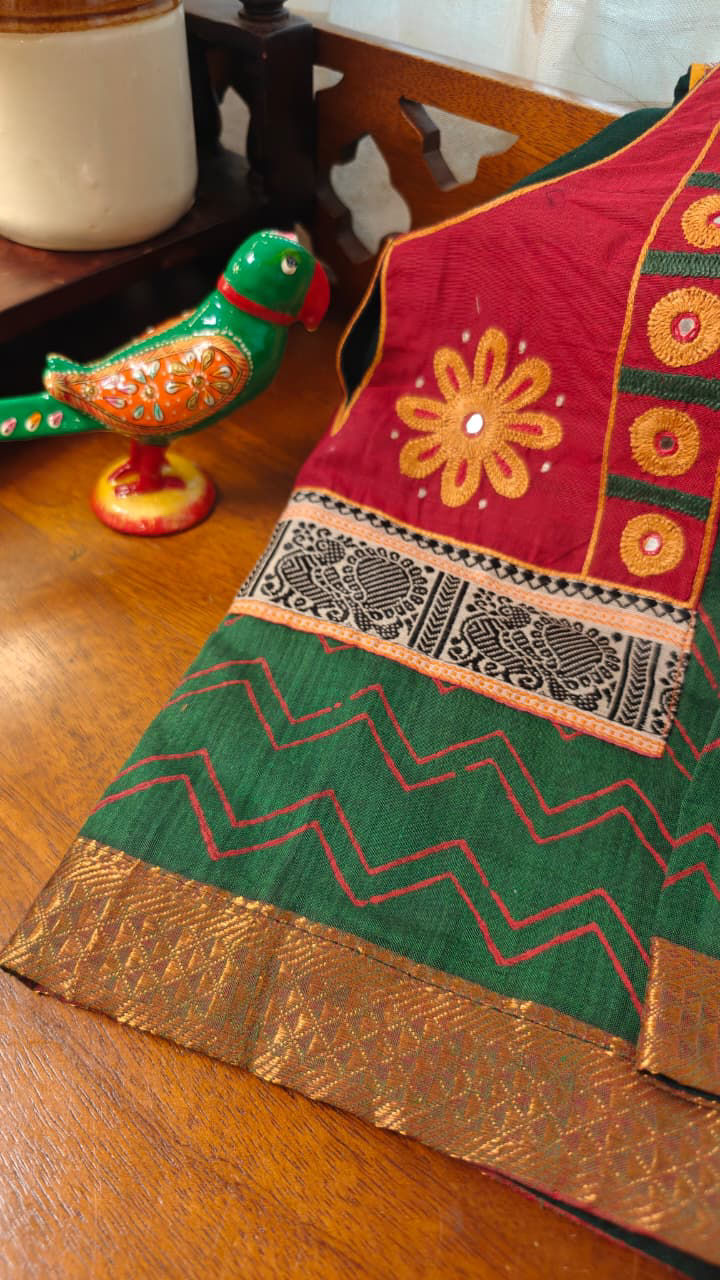 A rich emerald green cotton base paired with a deep red yoke — bold, grounded, and striking in contrast. Tribal embroidery brings rhythm and character, each stitch adding depth and quiet strength to the piece. Rooted in craft, yet easy to wear, this is cotton with presence.