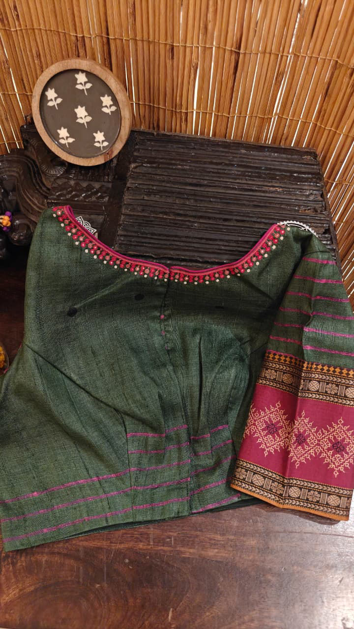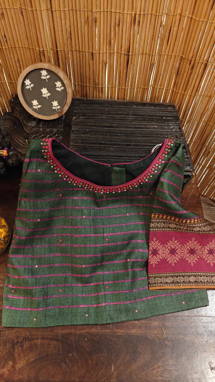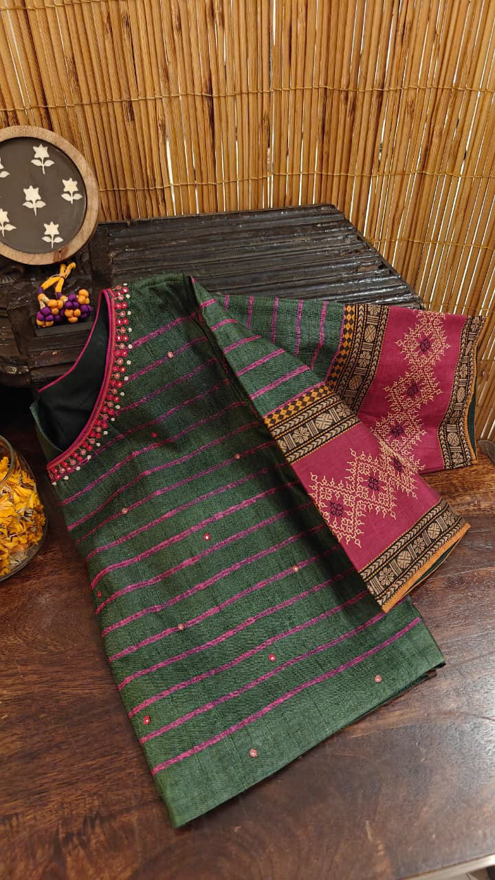 Forest green tussar silk, brought to life with intricate kasuti embroidery and a gentle fusion of pink. The richness of the base meets the delicacy of handwork, where every stitch adds depth and quiet character. A piece that feels rooted yet refreshing—crafted with care, and meant to be noticed without trying. ✨