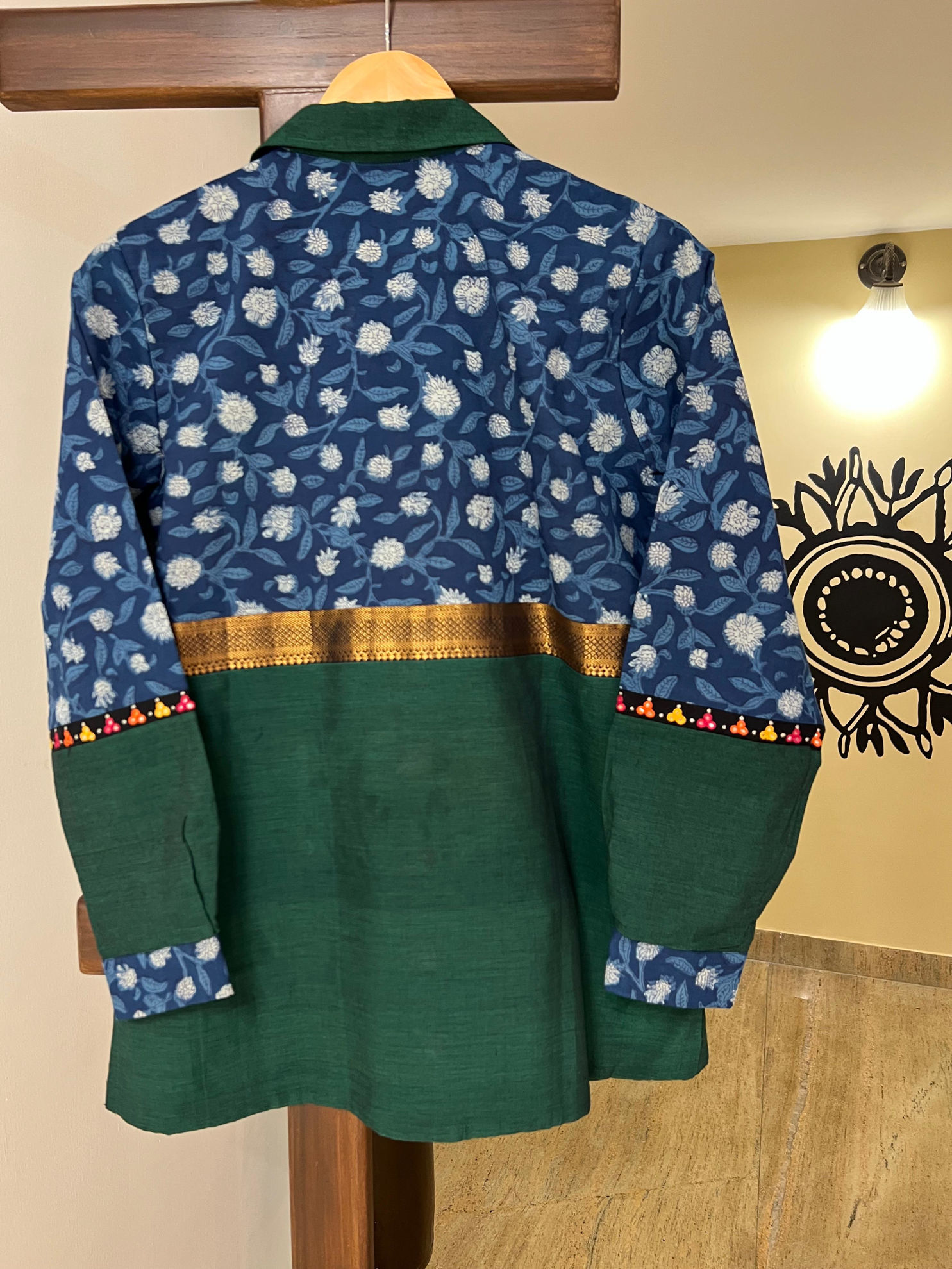 A beautiful fusion of indigo prints and green Mangalgiri cotton, brought together with delicate mukkati mirror detailing. A mix of textures and tones that feels refreshingly different — perfect to pair with your favourite jeans.🦚💚💙