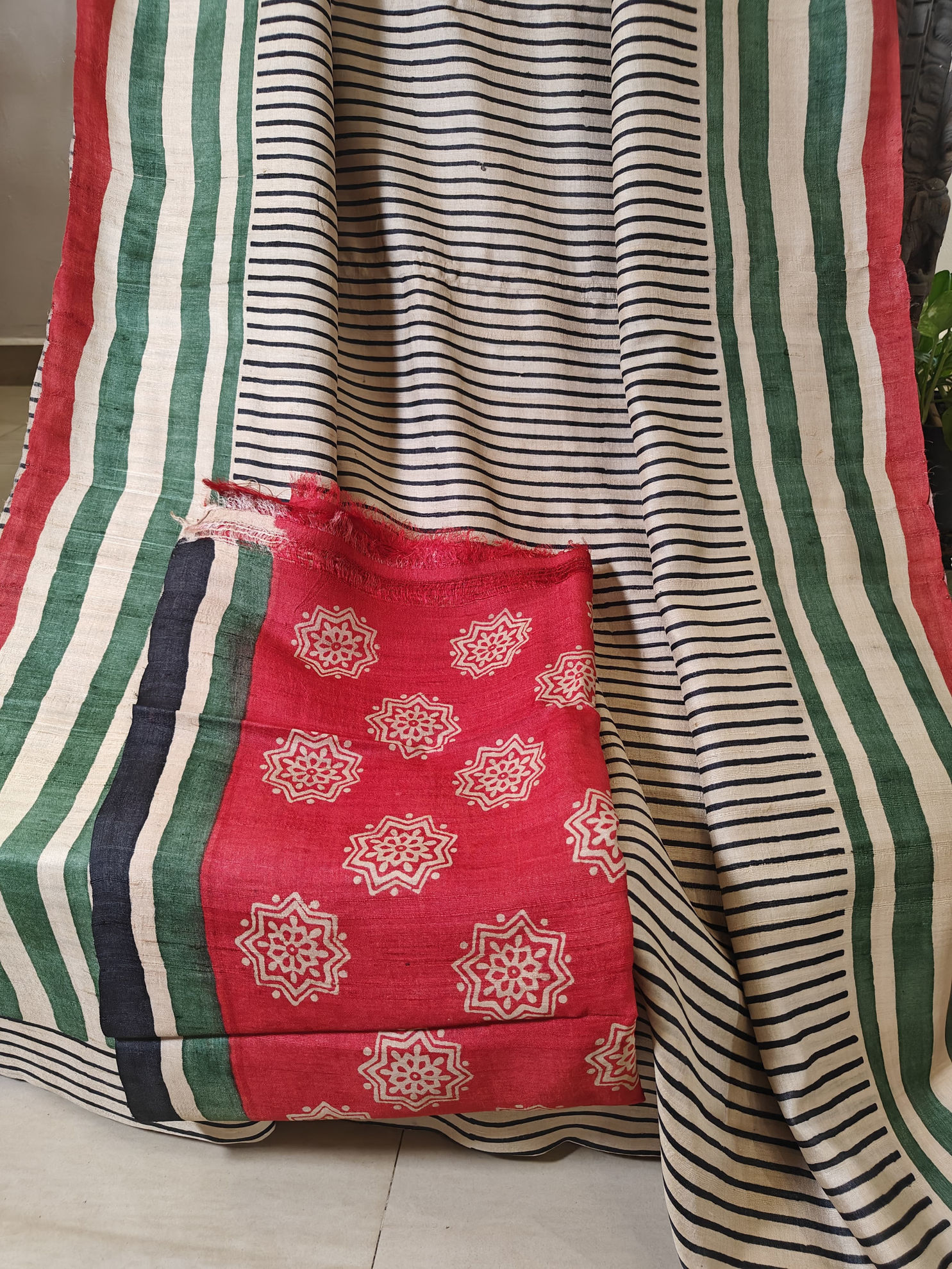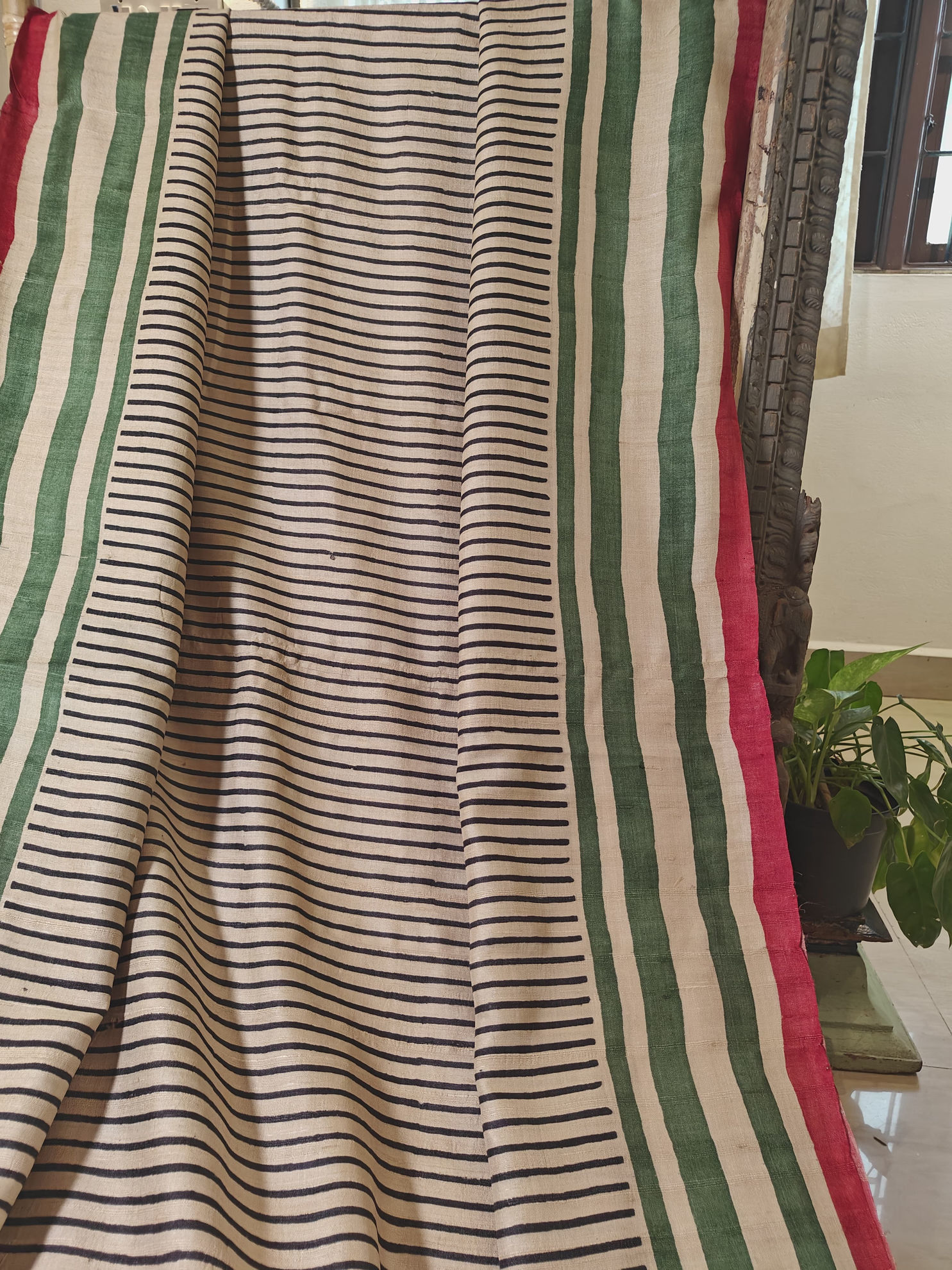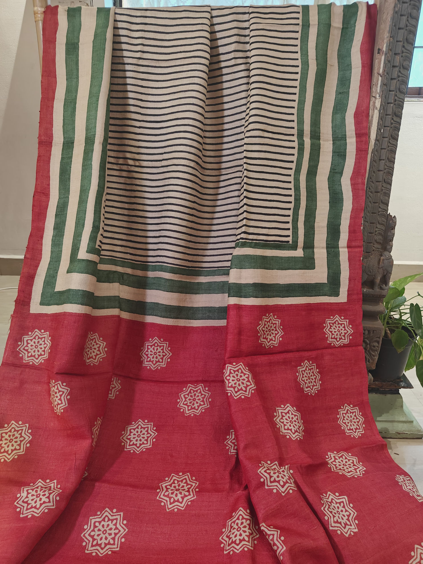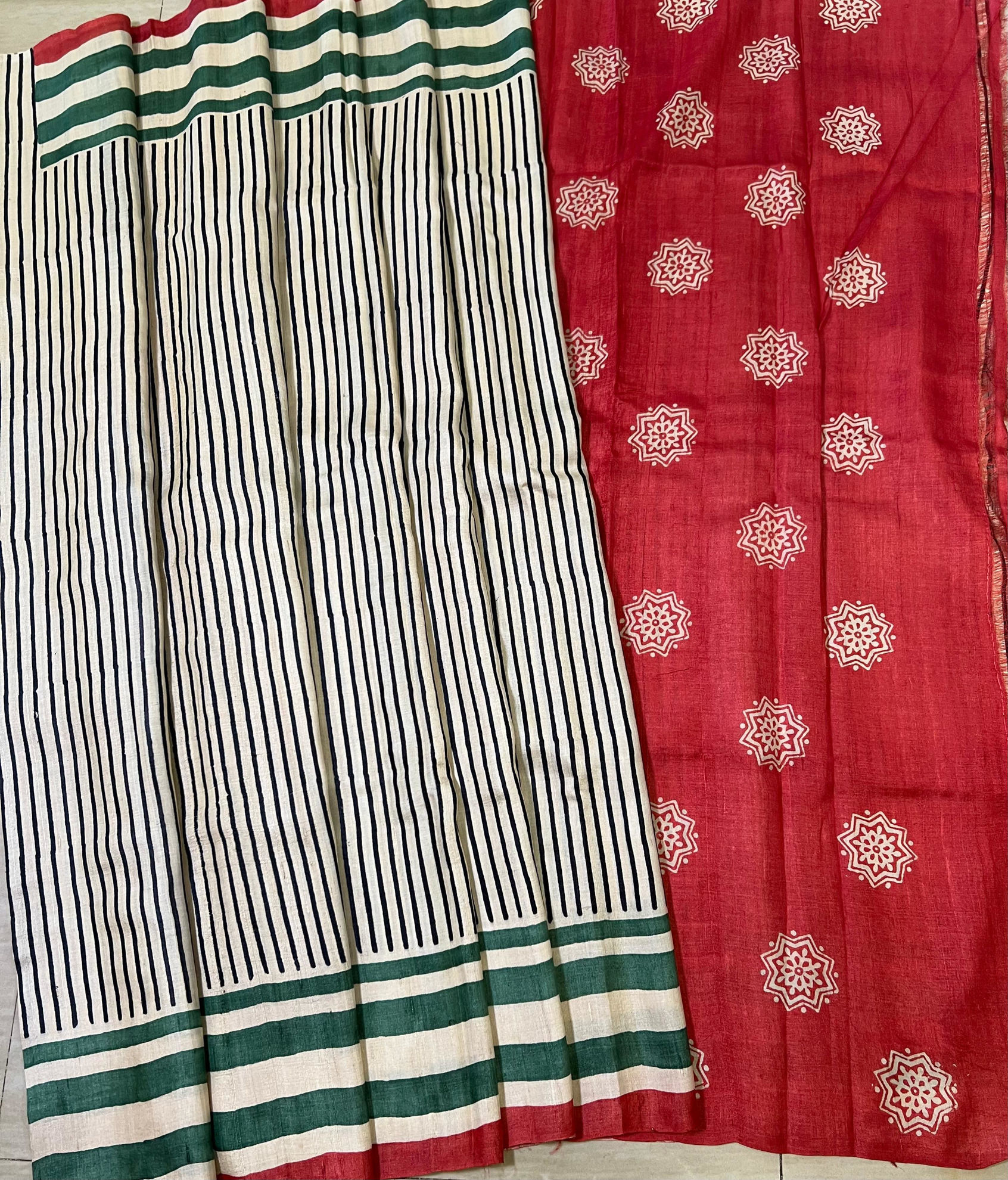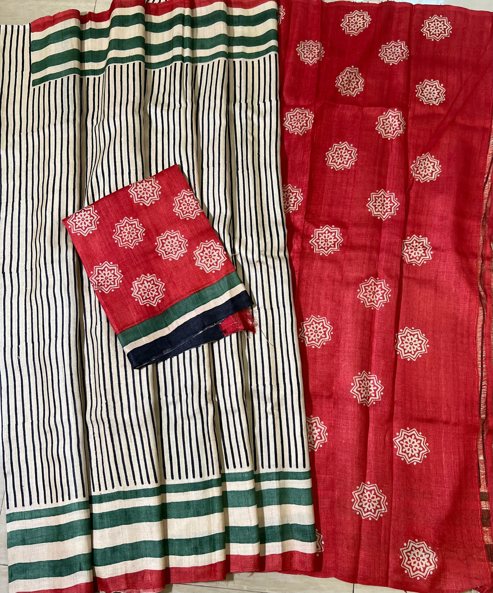 A gorgeous Tussar silk, crafted from yarn to dye to print — entirely designed at Svasa. This beauty features bold geometric lines and a striking mandala block print on the pallu, created using natural dyes and traditional techniques🪷🪷. Paired with a perfectly matched blouse that completes the look — a design that echoes the saree’s motifs with understated detailing.