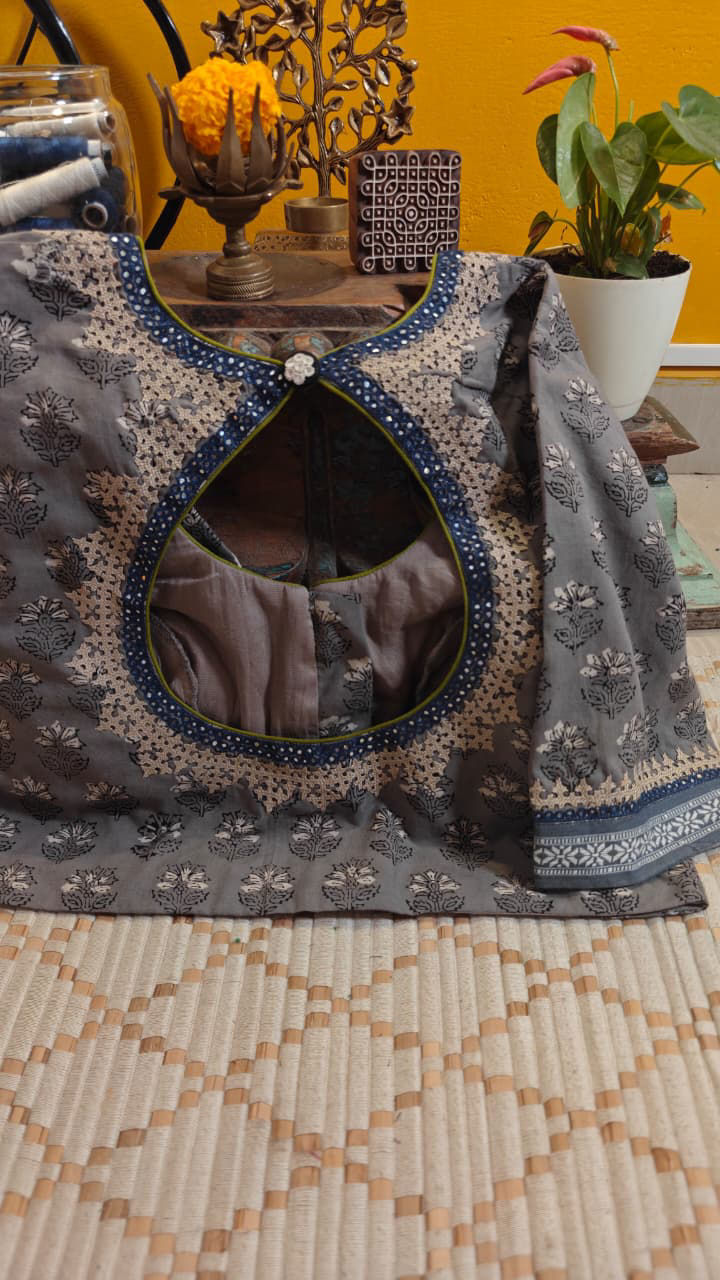A soft grey cotton base, brought alive with delicate block printing — subtle, rhythmic, and rooted in tradition. The muted tone becomes the perfect canvas for serene ivory embroidery, each stitch carrying the spirit of handcrafted detail.