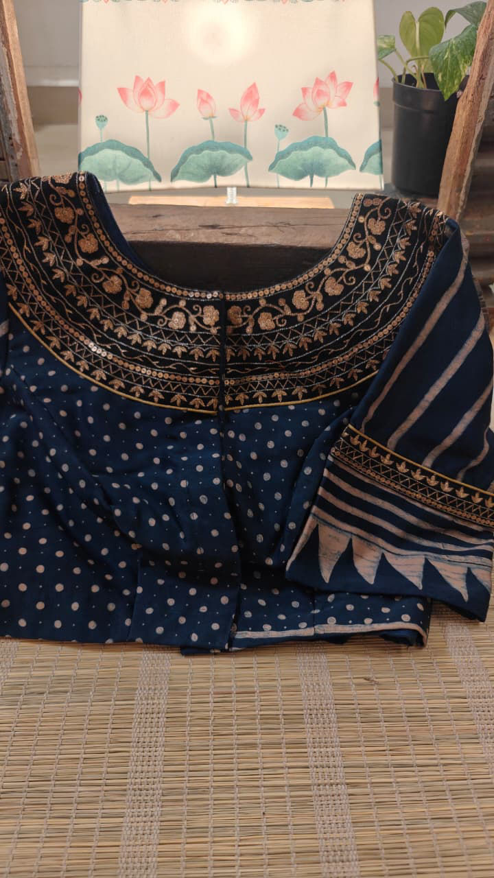 Indigo silk modal brought alive with classic block prints, finished with beaten gold embroidery that catches the light in just the right measure. A piece that feels rich, artistic, and quietly striking—where deep colour meets handcrafted detail with effortless beauty