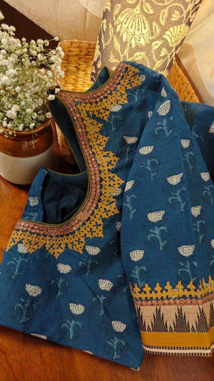 Deep indigo brought alive with Kutchi embroidery in warm ochre tones. Rooted in folk traditions, every stitch carries the earthiness of craft and the rhythm of the artisan’s hand. Timeless, soulful, and unmistakably handcrafted — a piece that speaks without trying too hard. Svasa exclusive.