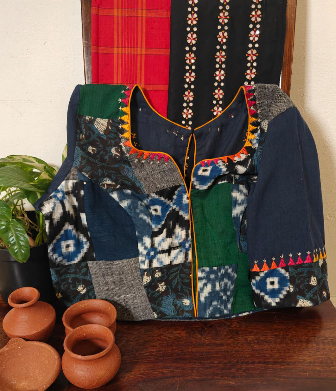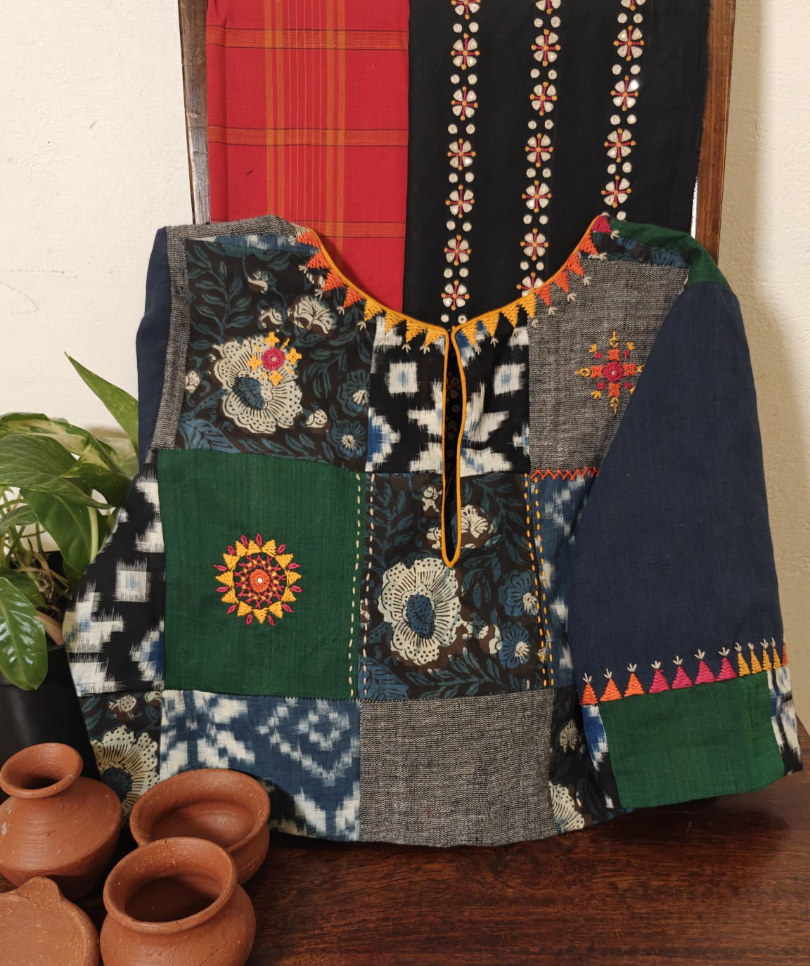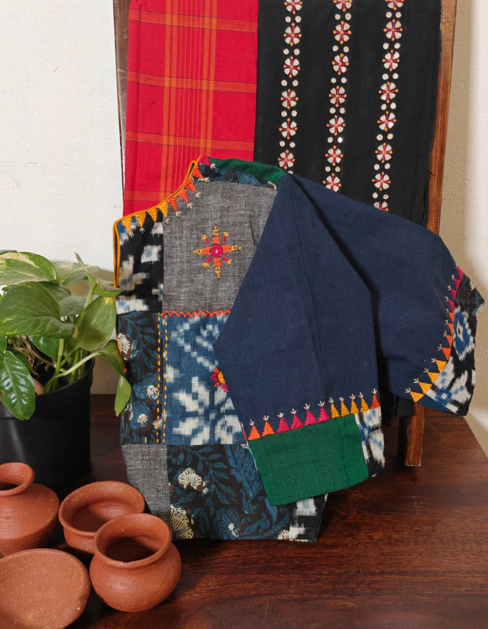 Patches of indigo and shades of green, fused together with abstract embroidery. A sustainable revival in vintage hues — timeless and handmade at Svasa. 🪡