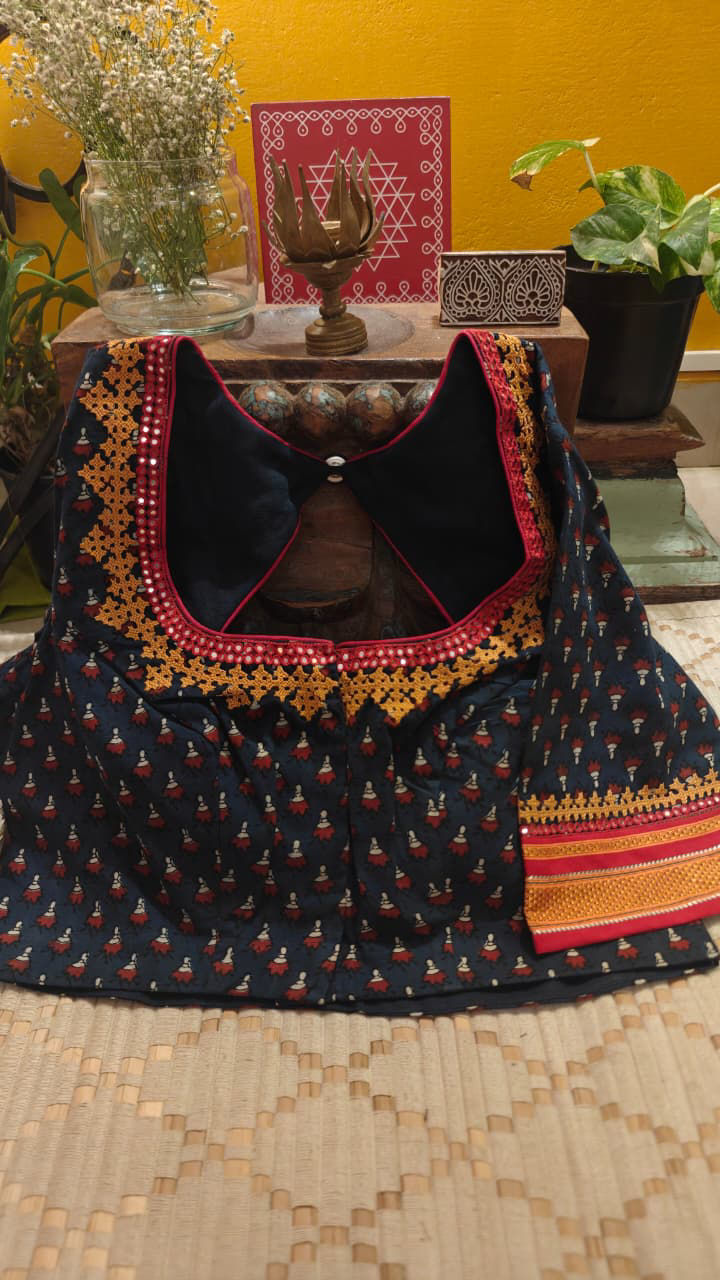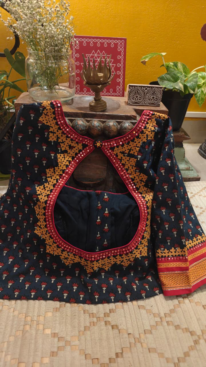 Indigo block prints set the base, brought alive with thick, rustic Kutchi embroidery that sits bold and unapologetic. Each stitch carries a raw, handcrafted energy— textured, grounded, and full of character. A beautiful interplay of print and craft, where tradition feels strong, earthy, and effortlessly expressive.