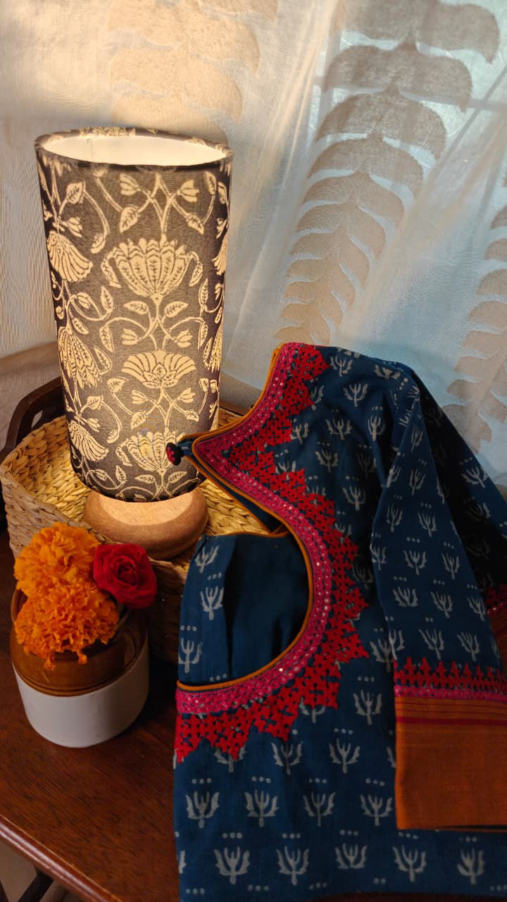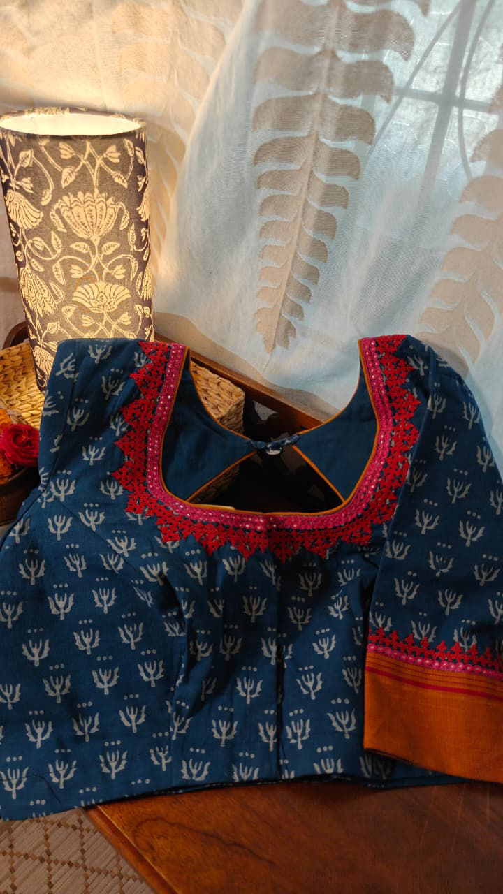 A classic, never-fail indigo blouse with a deep drop neck that always holds its charm. Kutchi embroidery in warm shades of yellow lights up the indigo base, adding a sunlit contrast and a gentle vibrance. Timeless, dependable, and handcrafted with quiet confidence—an essential that returns, season after season.