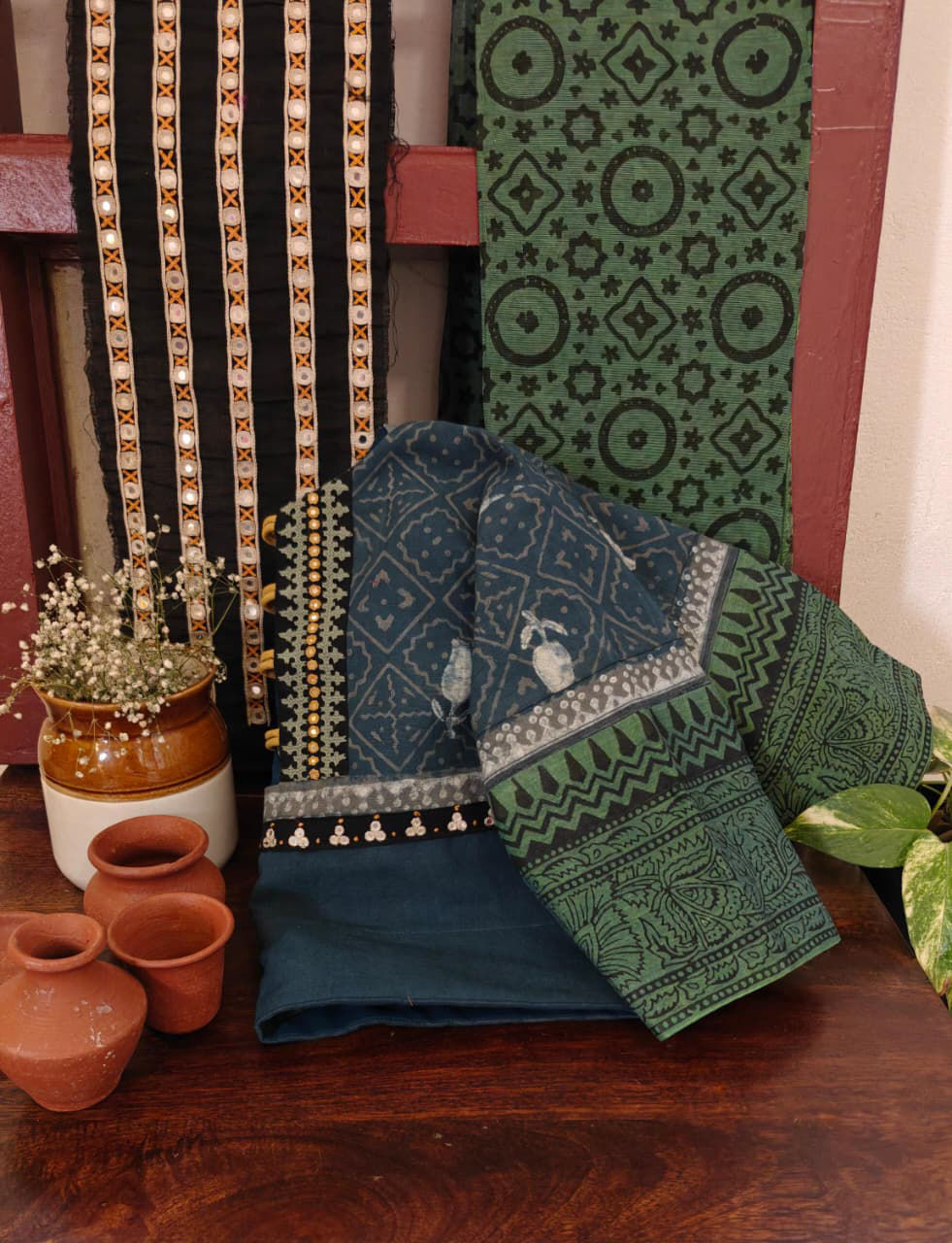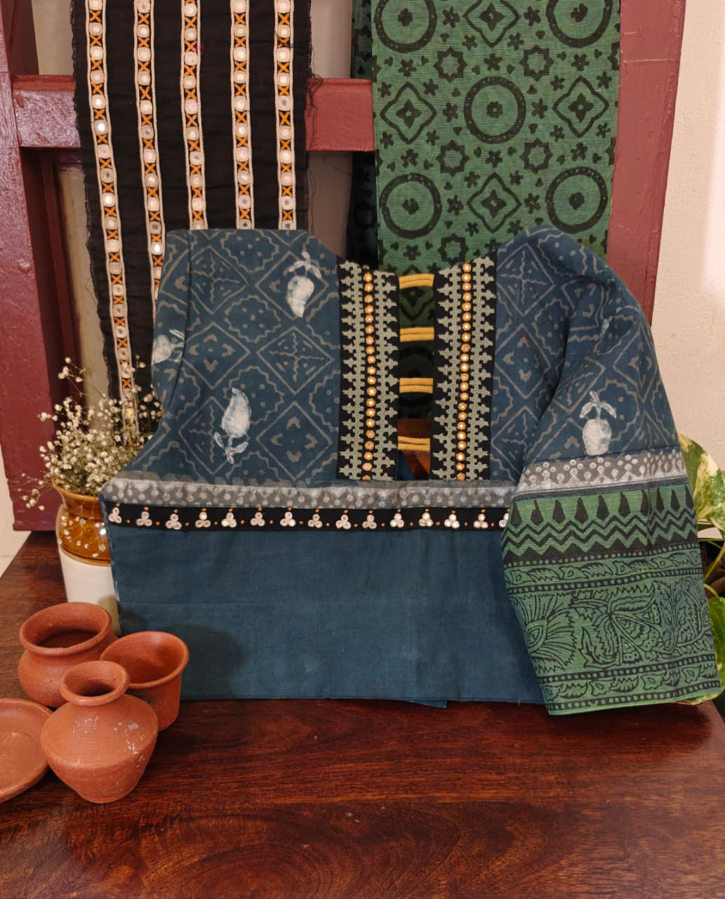 Hand-printed Indigo cotton handloom becomes the canvas for sincere craft. A rich jade green border frames the neck, hem, and sleeves, while Kutchi embroidered borders form the highlights..