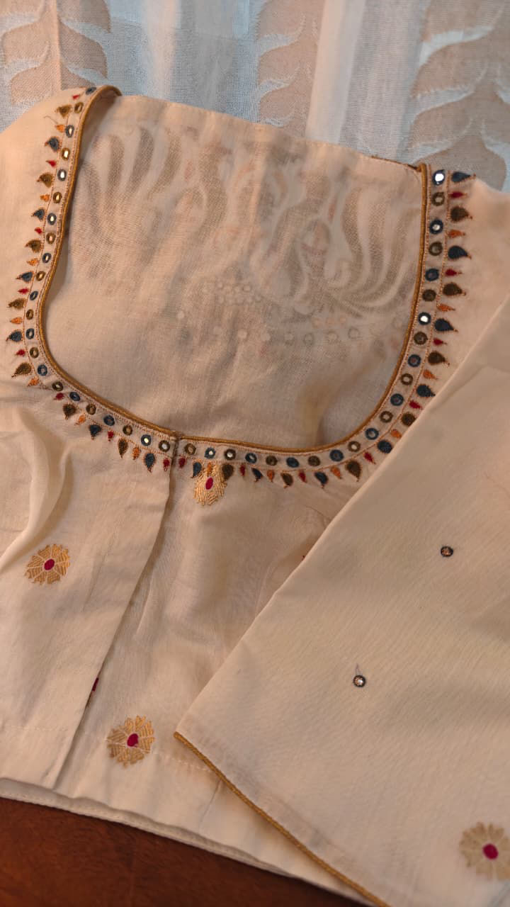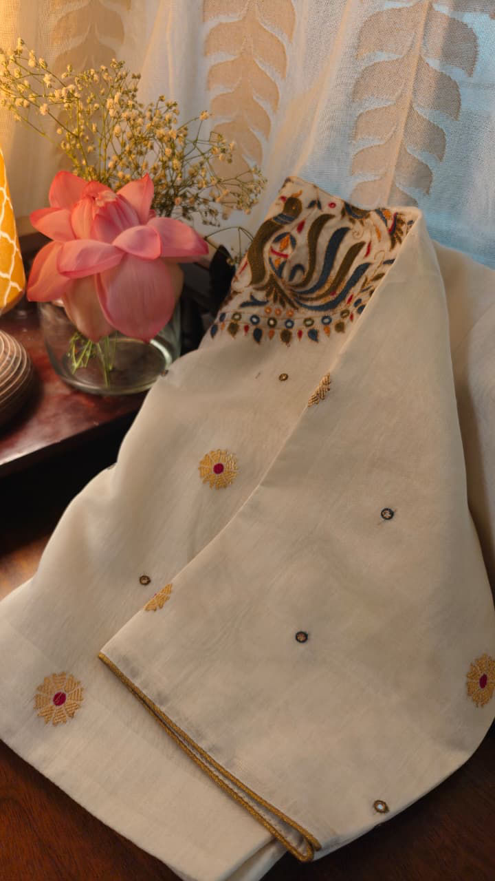 Chanderi in soft ivory, dotted with delicate gold buttis. The back comes alive with peacocks and florals, embroidered with quiet artistry. Unexpected, refined, and thoughtfully detailed — an unusual Svasa creation.