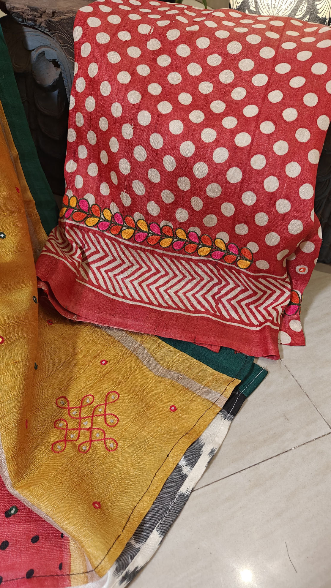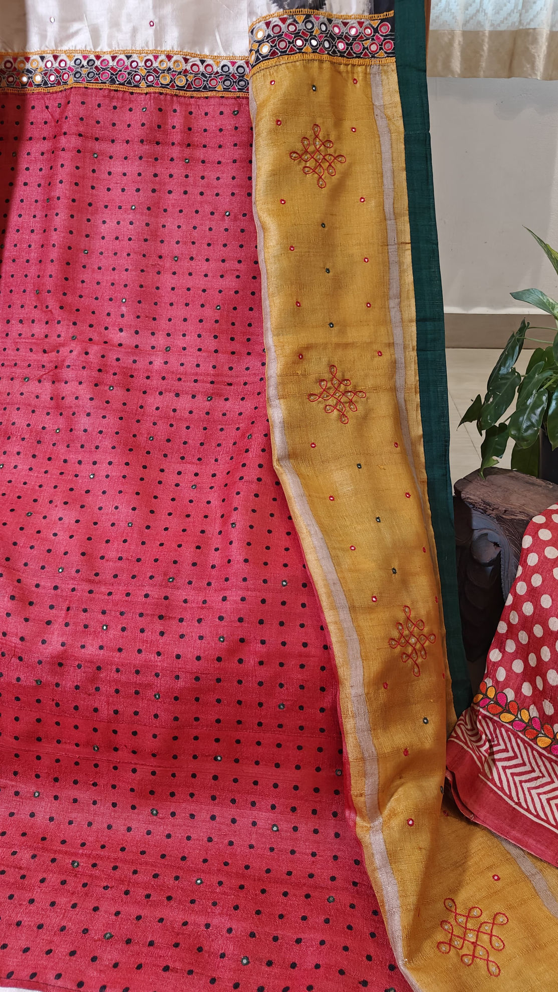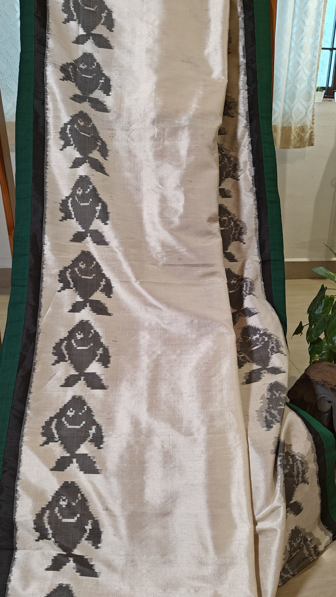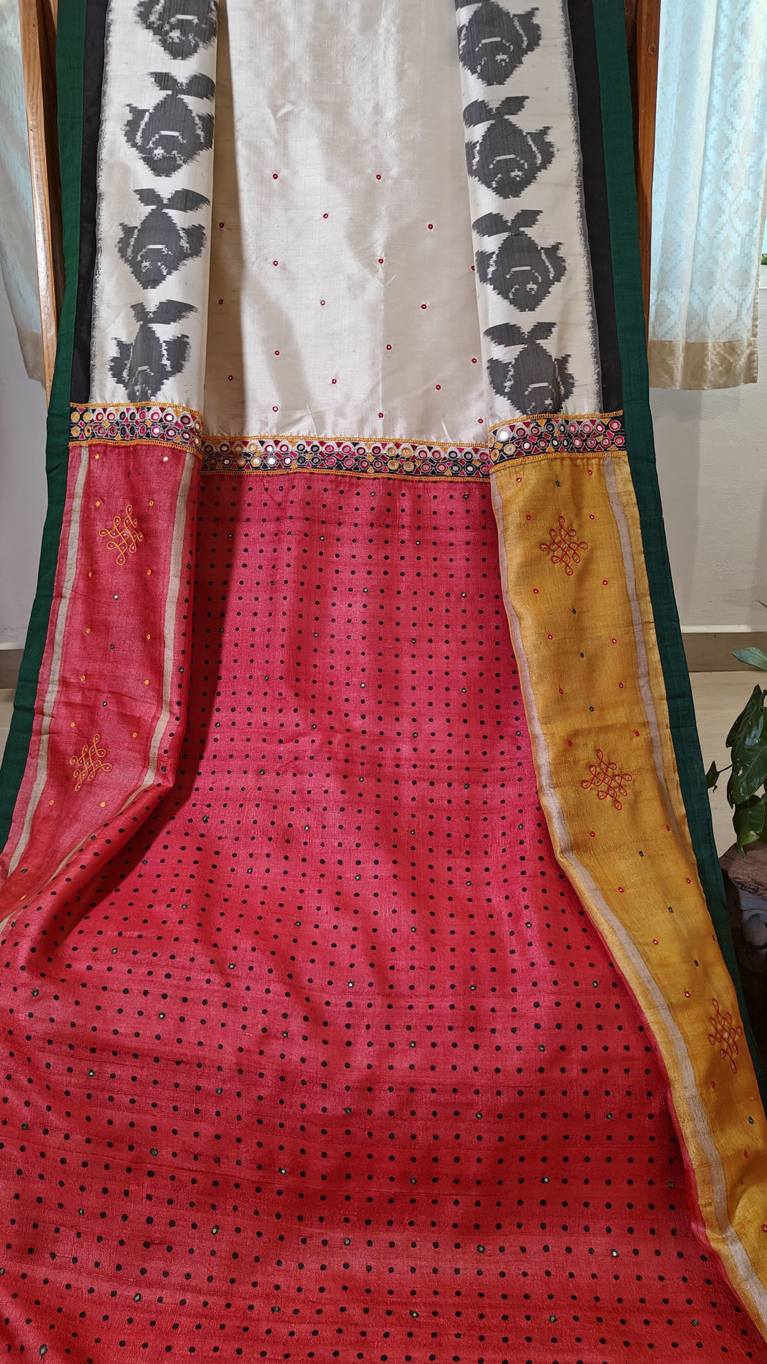 An ivory ikkat silk saree with delicate fish motifs woven in — subtle yet striking. The pallu tells a story: Polka dots block printed by hand, Kolam motifs embroidered with care, Ganga Jamuna borders that frame tradition, and mirrors that shimmer with every step. Finished with a matching blouse, this is a saree set made once, never again. Unusual. Soulful. Unrepeatable.