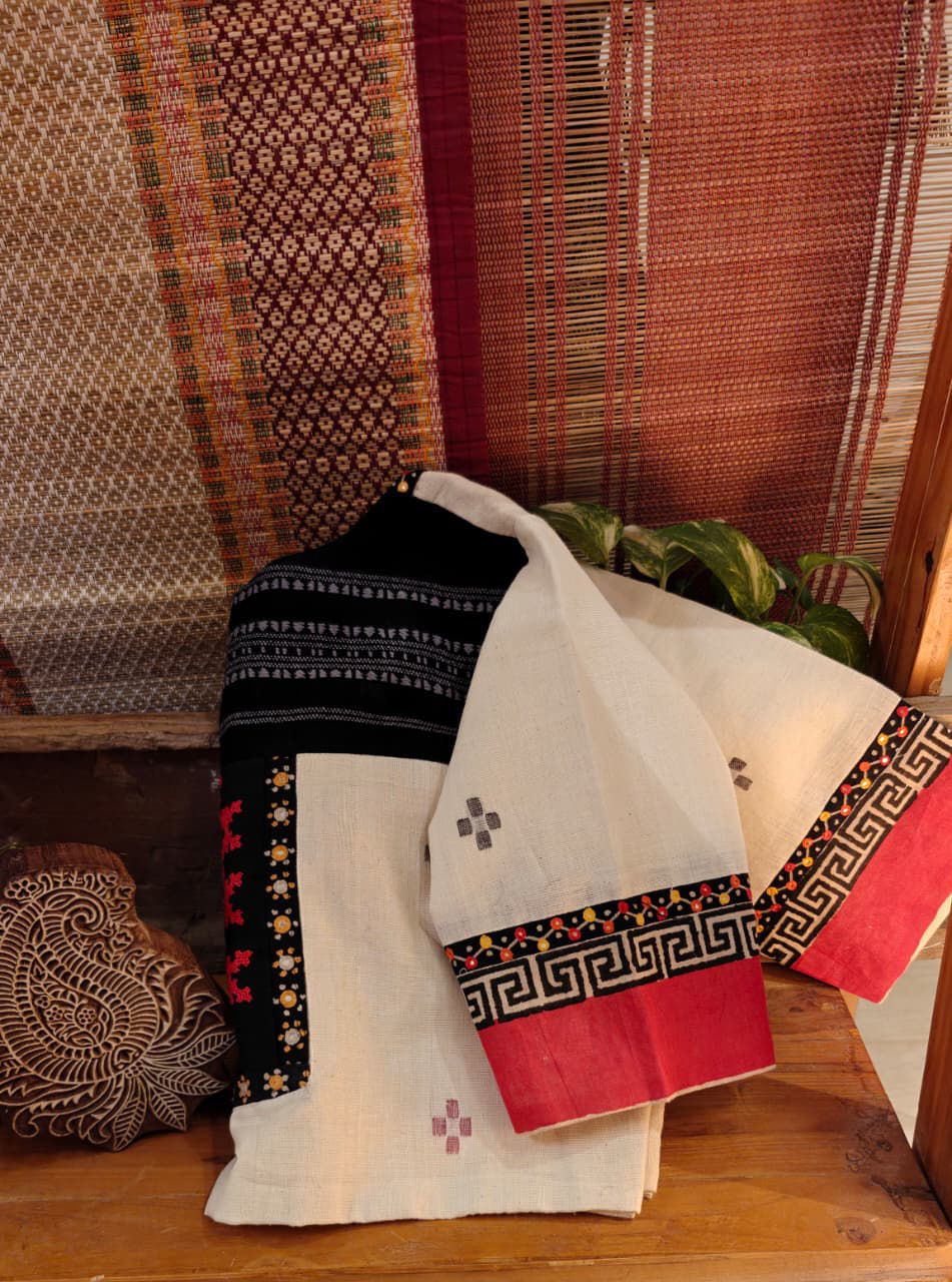 An ivory cotton base brought alive with bold tribal borders and detailed Kutchi embroidery. Rooted, handcrafted, and timeless—this piece carries the strength of tradition in every stitch. Pure cotton. Quietly striking. Crafted the Svasa way.