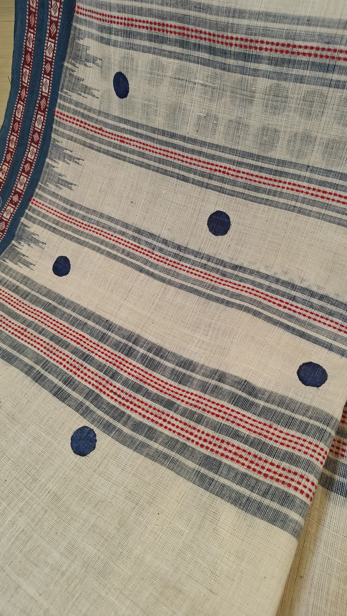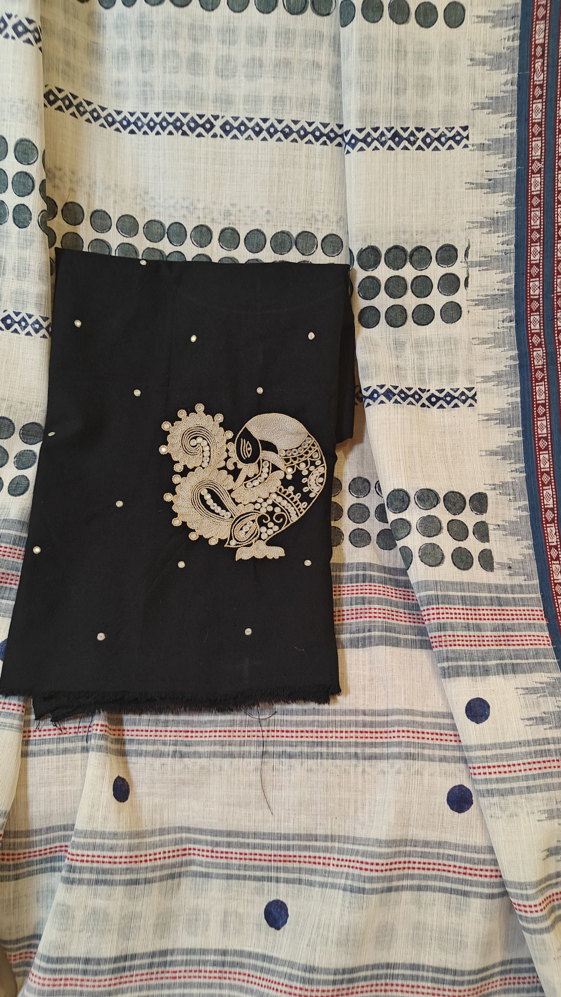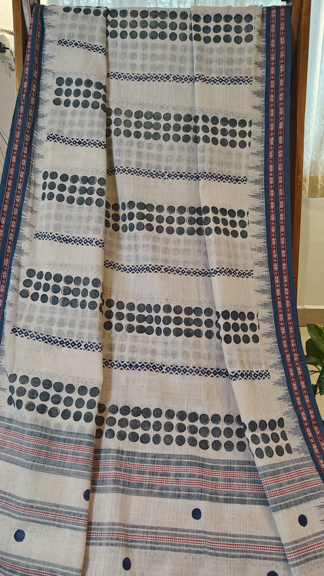 A timeless pairing: a classic Ponduru weave in ivory, block printed with vertical geometric designs in deep indigo blue. Handspun. Handwoven. Rooted in heritage. Paired with an unstitched blouse in the same indigo, designed with an elegant ivory Annam embroidered at the back — simple, soulful, and steeped in tradition.