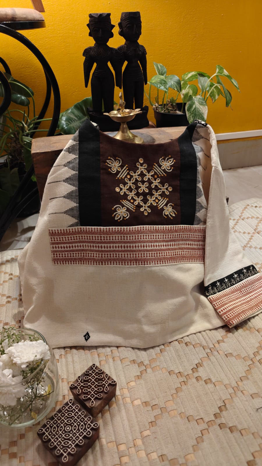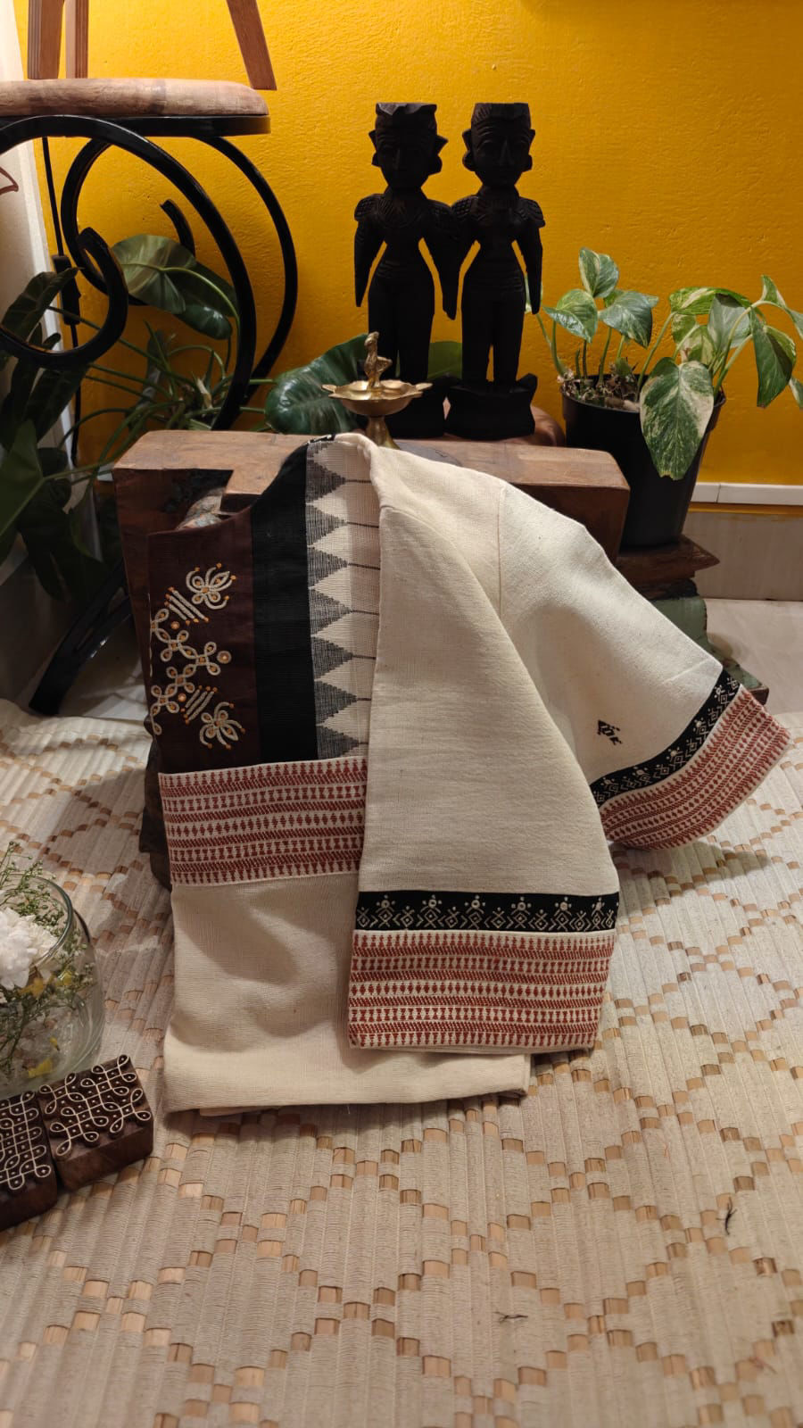 Ivory kora cotton brought alive with a hand-drawn kolam motif, rooted in quiet symbolism and everyday ritual. Framed with Bhujodi borders, the piece carries a gentle rhythm of craft—earthy, grounded, and deeply familiar. An understated cotton creation where tradition sits effortlessly within simplicity, meant for those who find beauty in calm, lived-in textures.