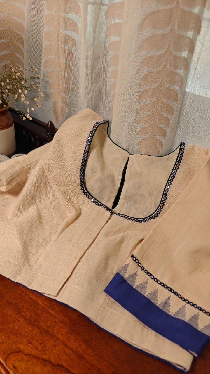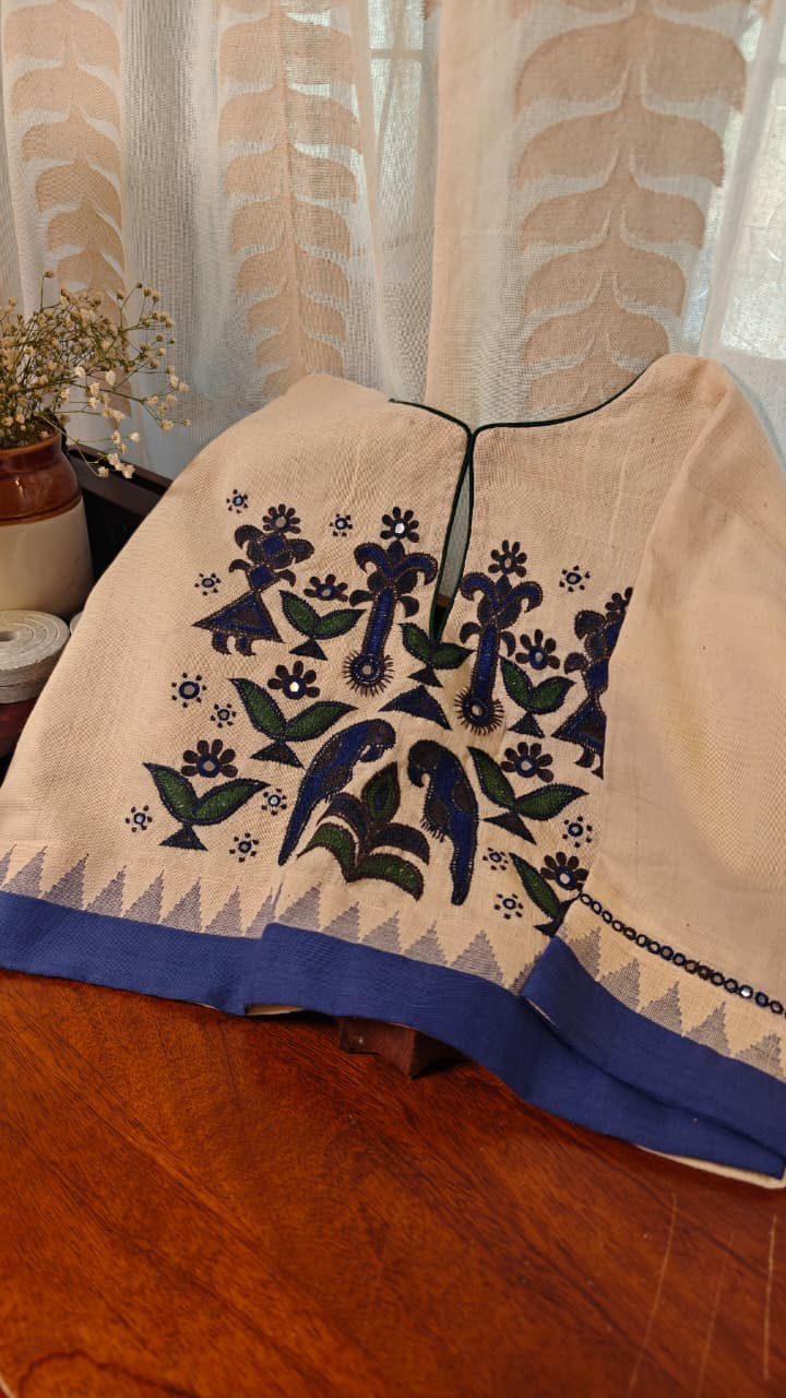A classic Ponduru in soft ivory, framed with a blue border and detailed with tribal embroidery in blue and gentle shades of grey. Rooted in handspun tradition, textured and earthy, this piece carries a quiet strength and timeless appeal. A true classic, thoughtfully crafted the Svasa way.