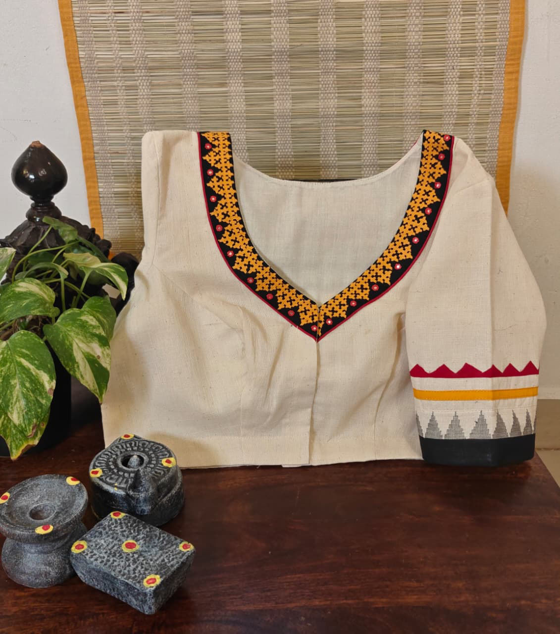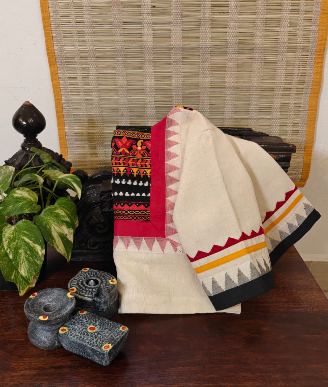 An Ivory & Red Ponduru base fused with an iconic red body — rustic in feel, honest in fibre. Tribal borders are embroidered by hand around the yoke, each stitch hand-hemmed to celebrate craft over perfection. .