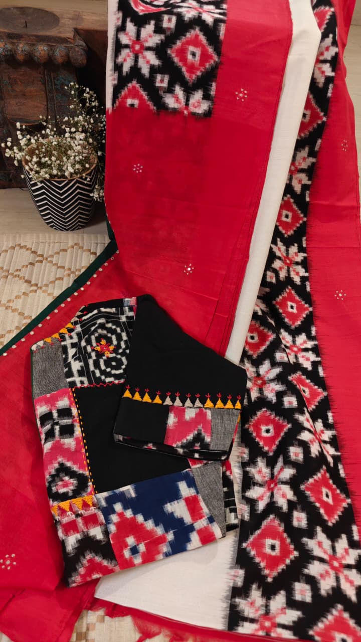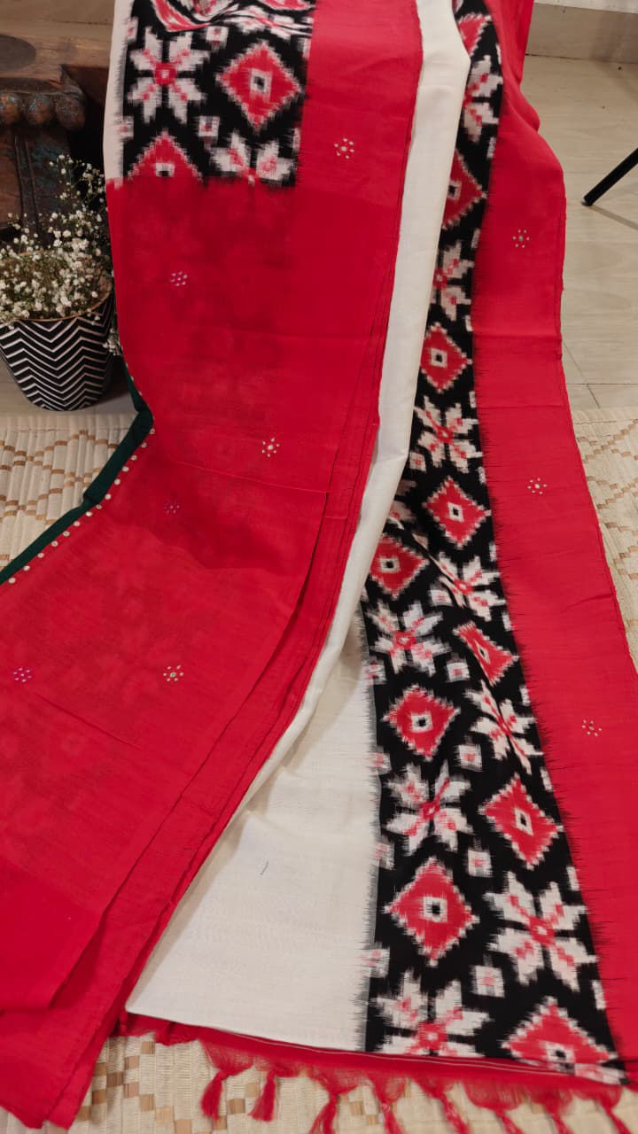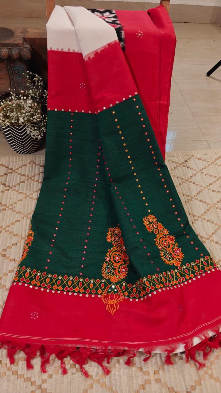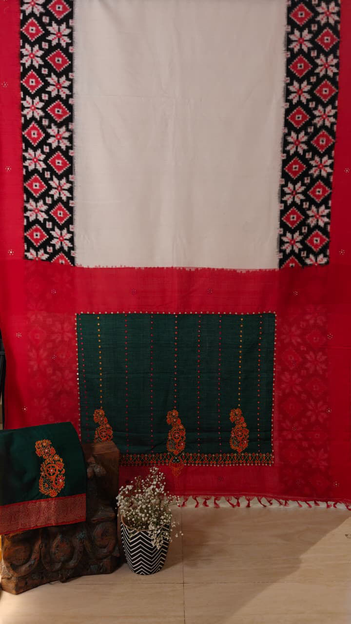 A gorgeous ivory Telia Rumal saree, framed with a striking border in red and charcoal. The pallu unfolds in a deep green, exquisitely embroidered to add depth and quiet richness. Paired with an embellished unstitched blouse, this ensemble brings together tradition, craft, and timeless appeal.