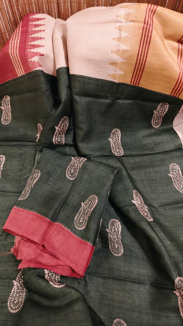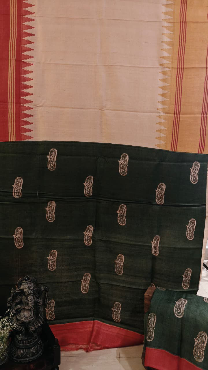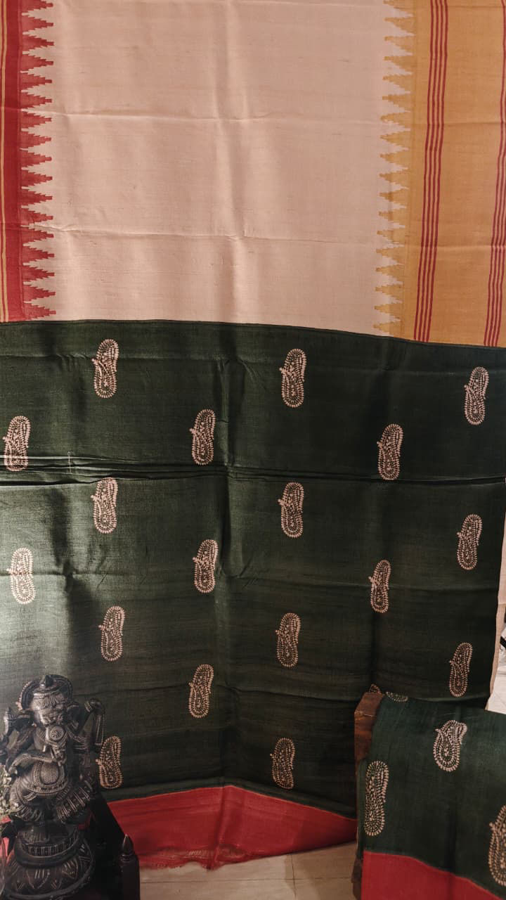 Ivory with Ganga Jamuna and Forest Green Pallu An elegant ivory saree brought alive with a striking Ganga Jamuna border in radiant yellow and deep orange, creating a vibrant frame against the serene body. The highlight is the forest green pallu, richly adorned with paisleys hand block printed across the deep green canvas — a classic motif that lends both depth and character to the drape.