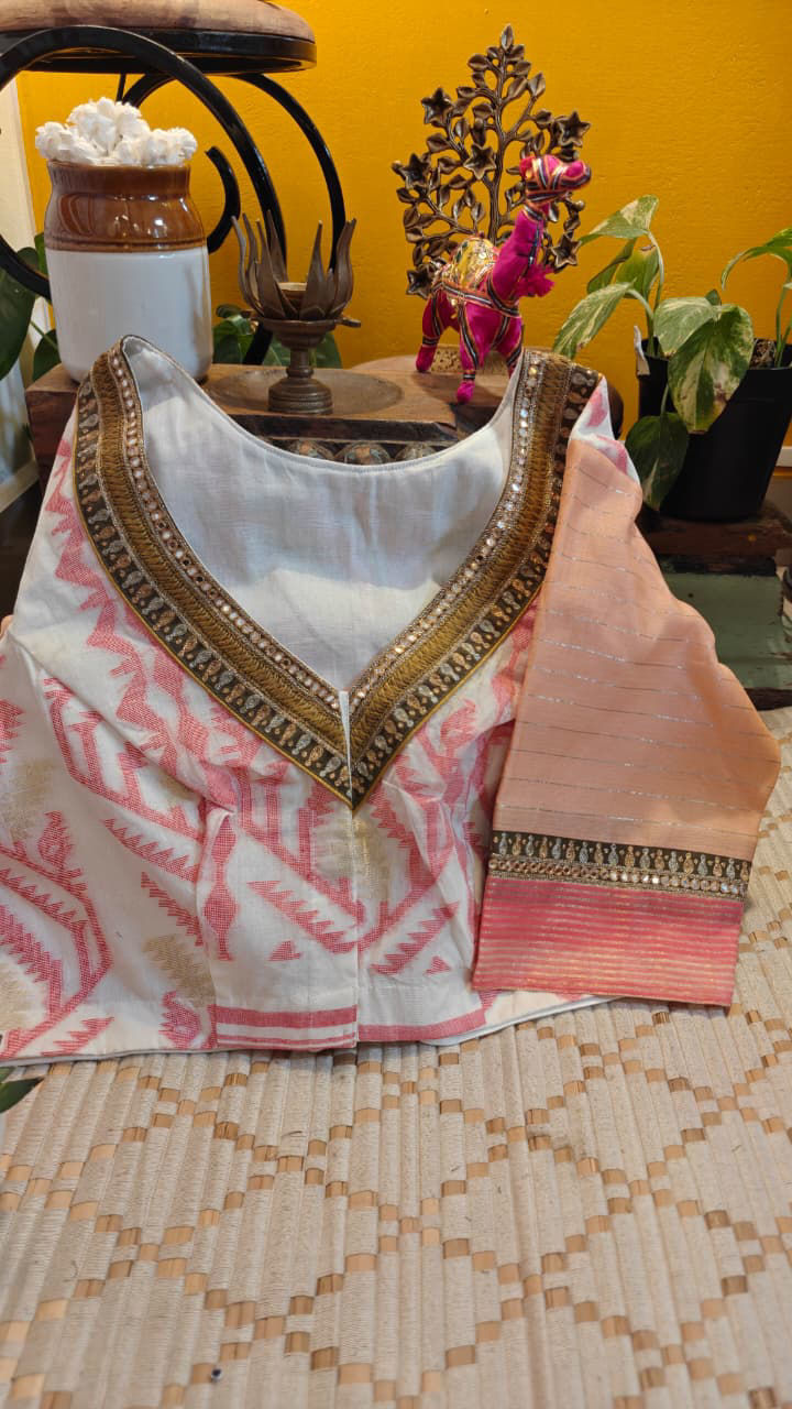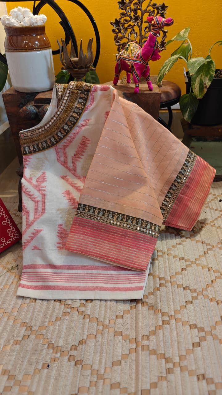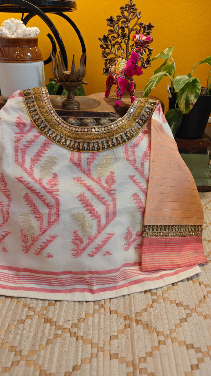 Ivory, pink, and gold come together in a timeless Jamdani, layered with beaten gold embroidery that adds depth without overpowering its weave. Subtle, detailed, and enduring—crafted for moments that call for something quietly unforgettable.