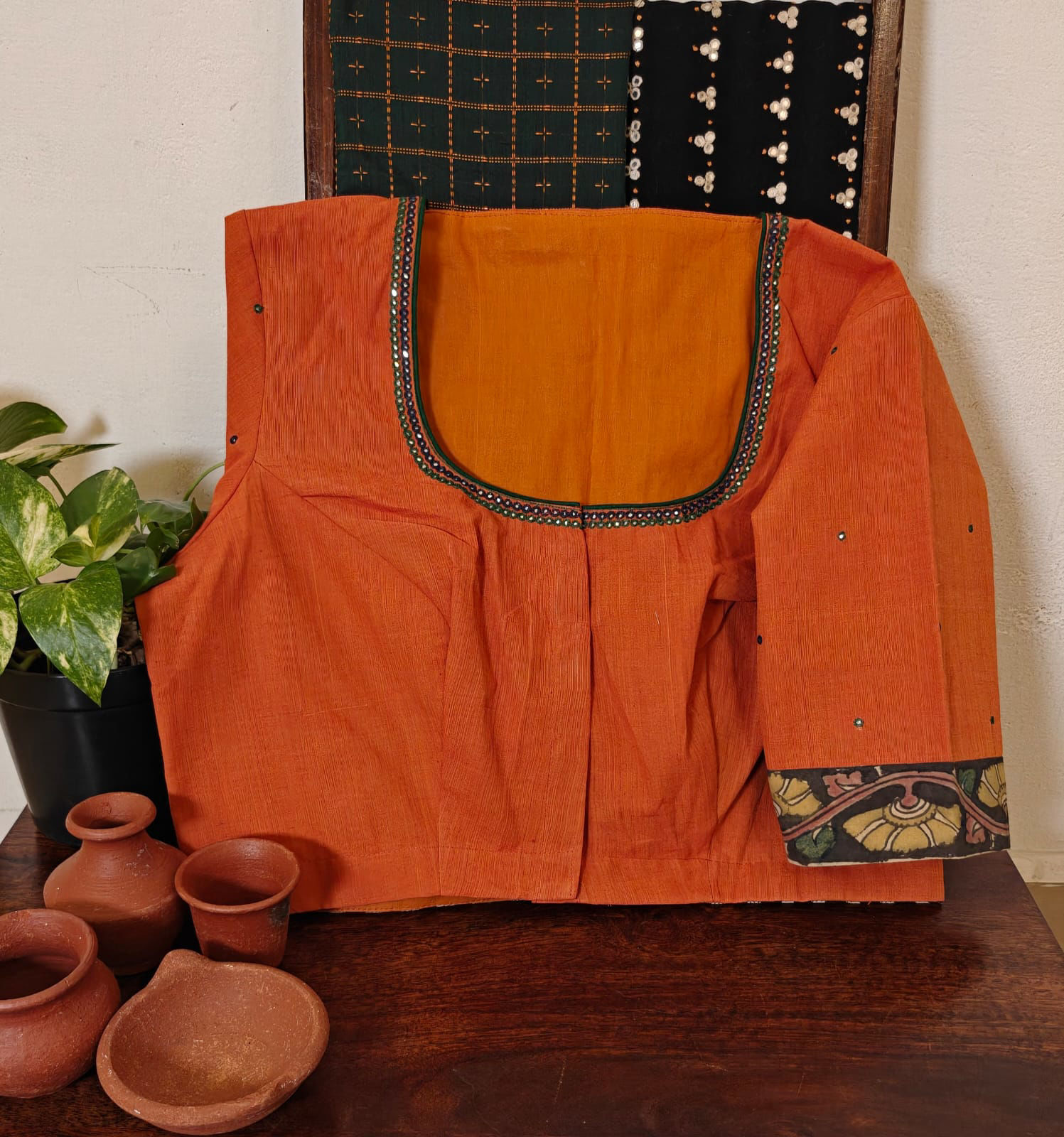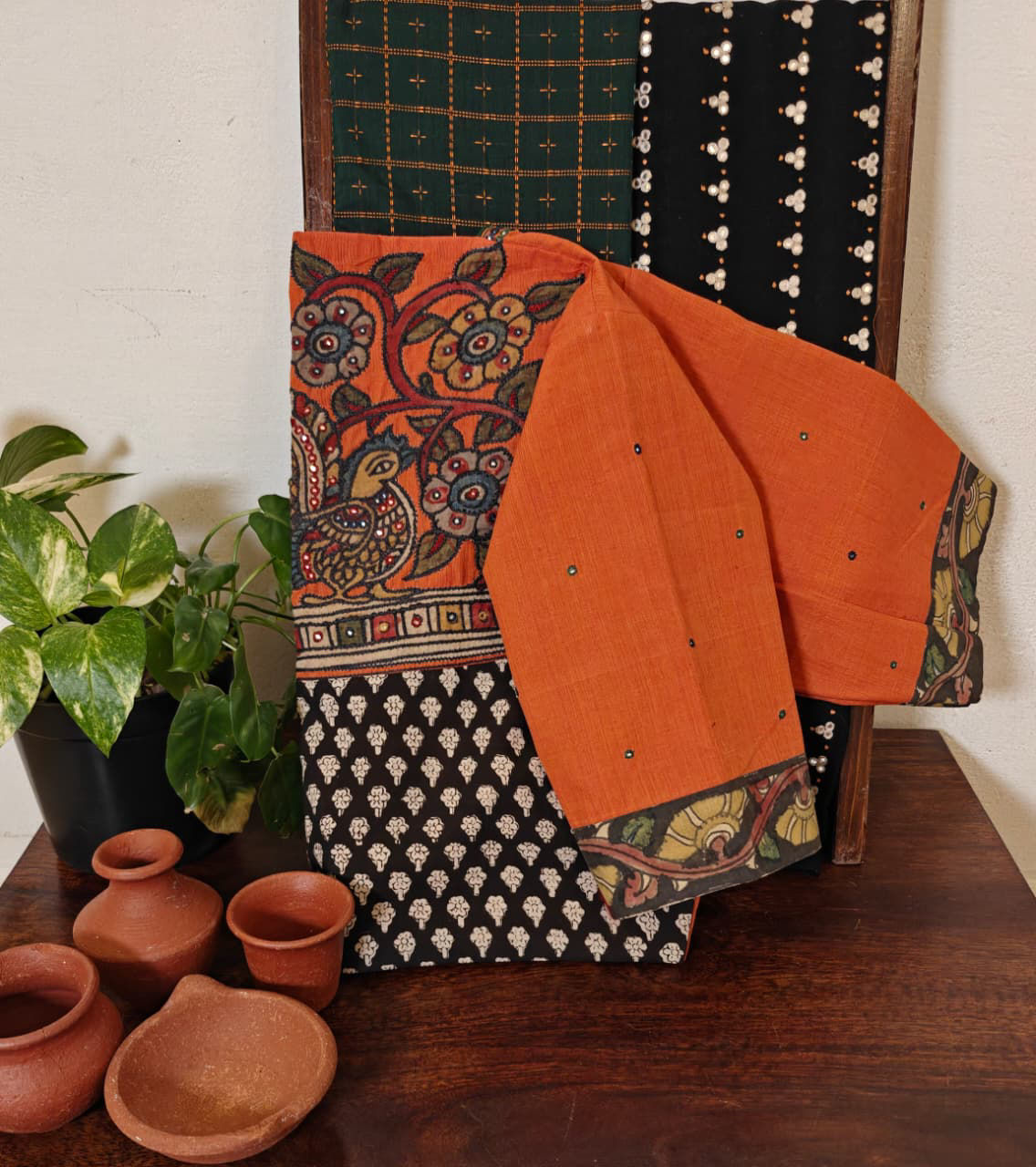 A kalamkari appliqué on a rich orange base, fused with hand block prints. Stitched, hemmed, and finished by hand. A Svasa revival — classic, rooted, and timeless.