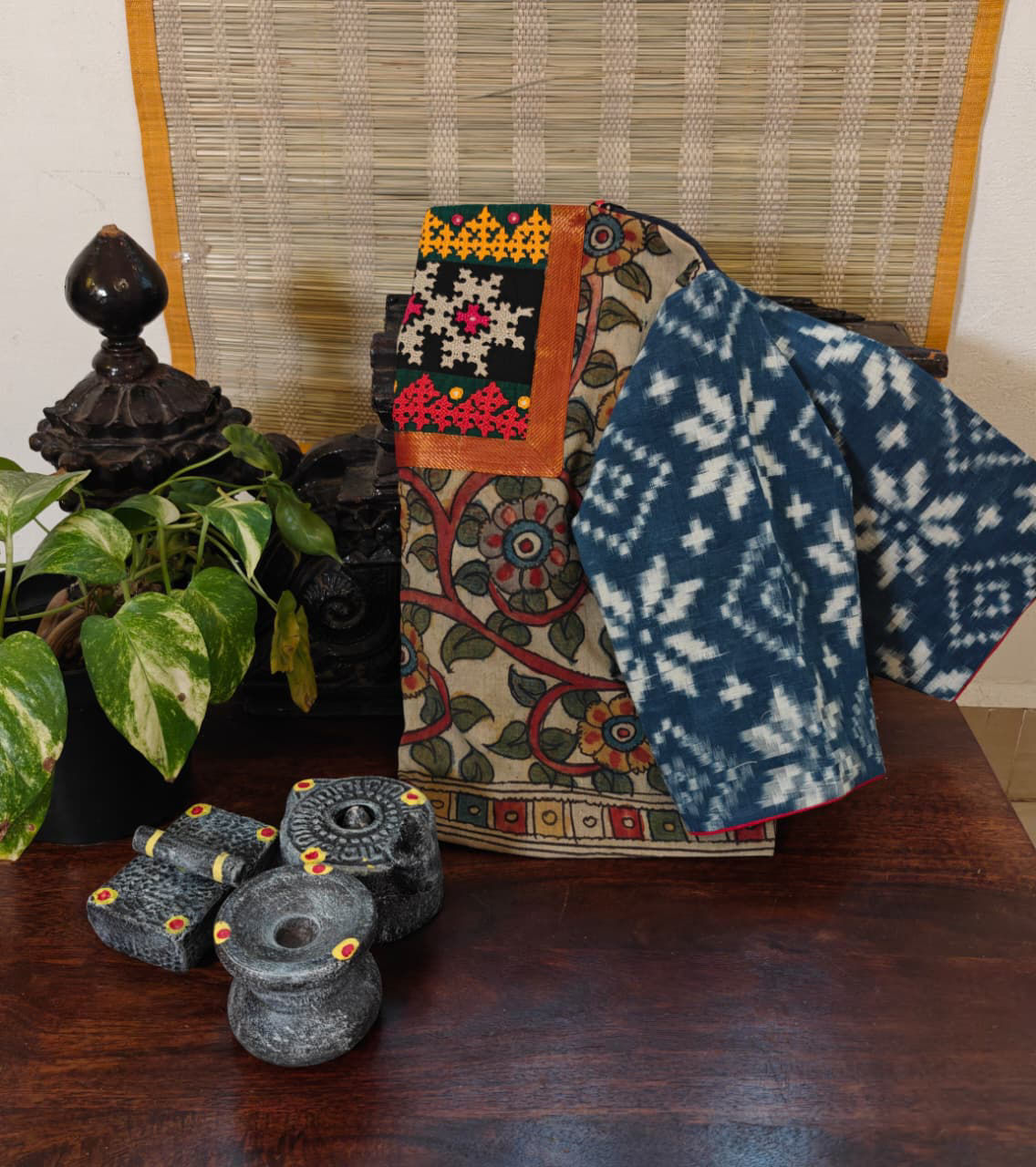 🎨 Hand‑painted Kalamkari meets ♻️ eco-woven Ikkat patches 🪡 Kutchi stitches dancing around the yoke 🌿 Sustainable • Handmade • Limited edition 💛 Earthy yarn tales in every knot & motif