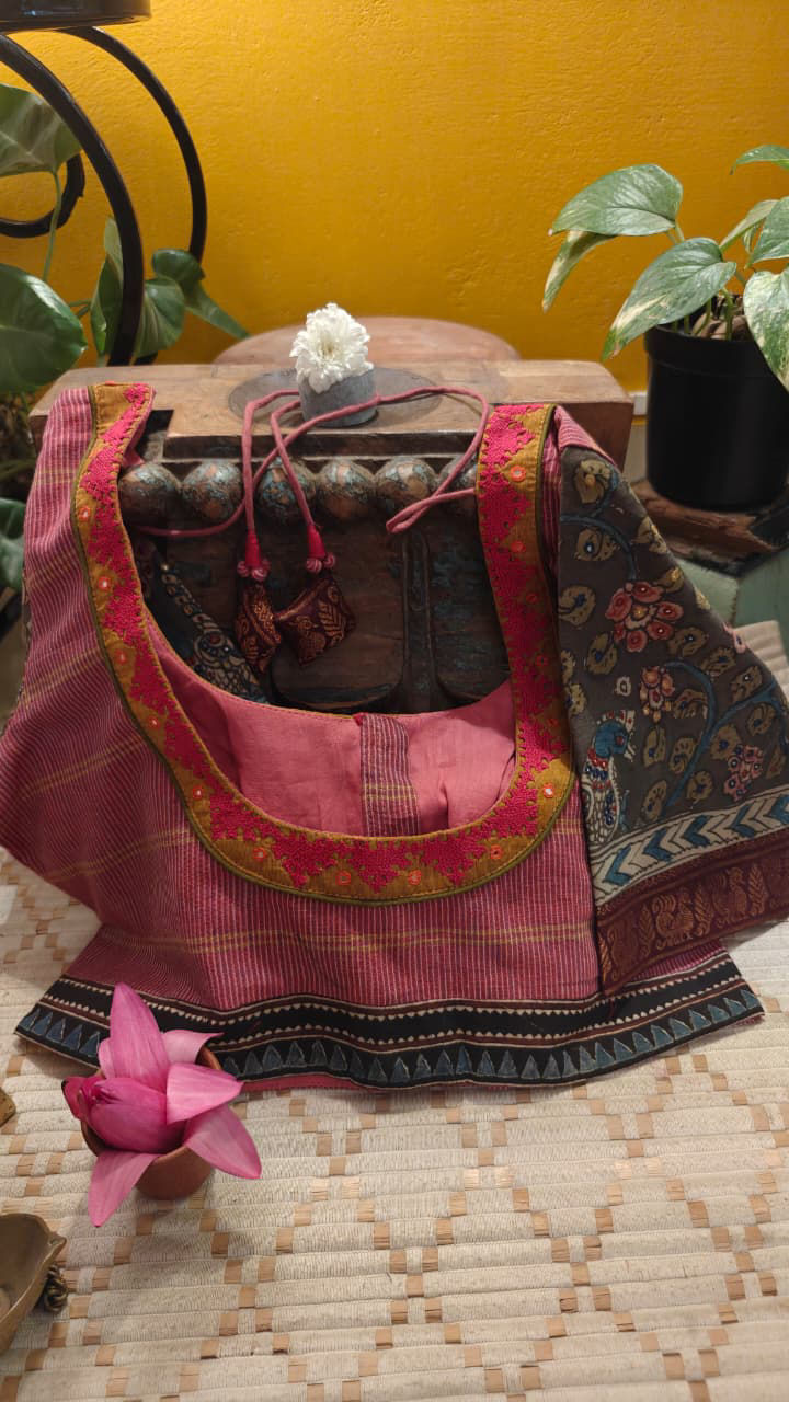 A rich green cotton base sets the tone, layered with hand block prints that carry rhythm and texture. Tribal embroidery adds depth and strength, while Kalamkari appliqué anchors the piece in heritage detail.