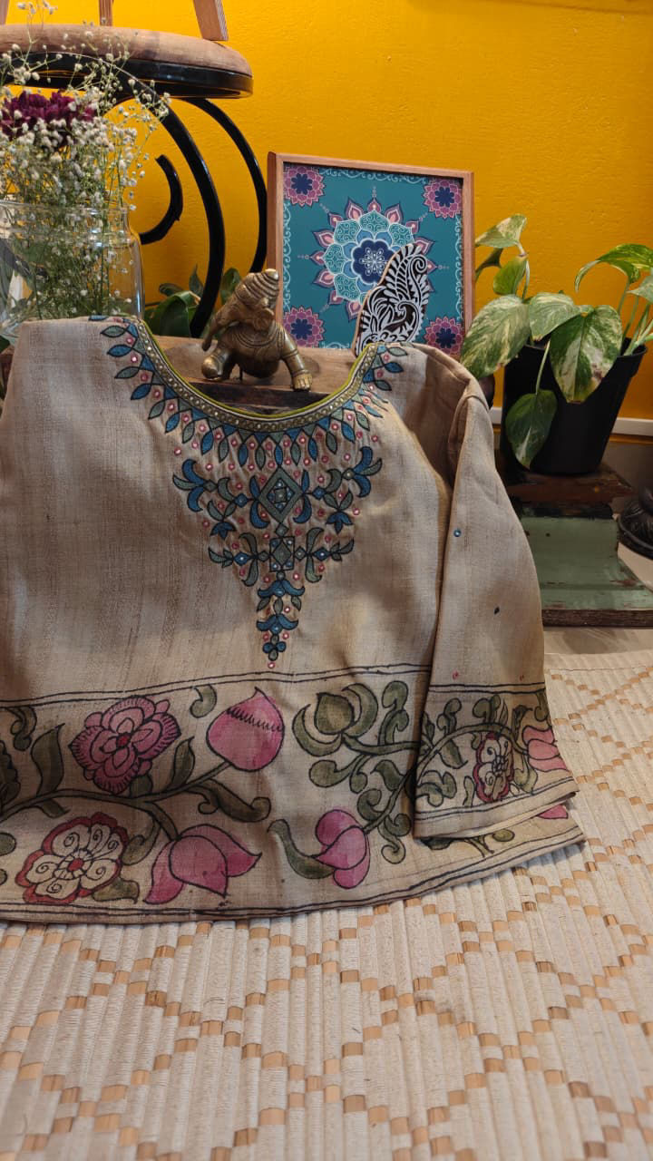 Kalamkari on Raw Tussar — Pastel Threads