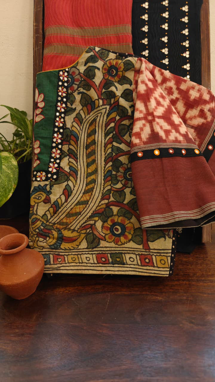 A classic eco ikkat fused with hand-painted kalamkari. Motifs drawn by hand, borders embroidered in threads that speak of time and craft. No two pieces alike. This is the kind of magic that stays.